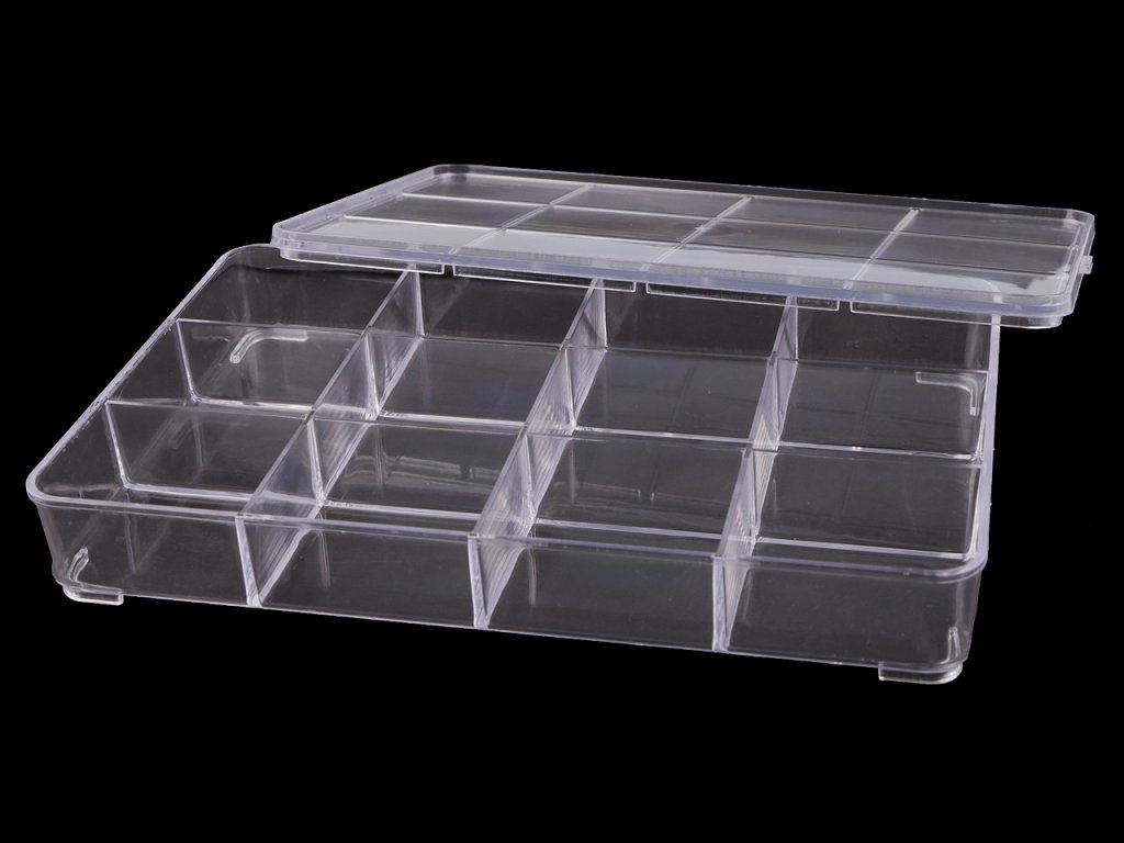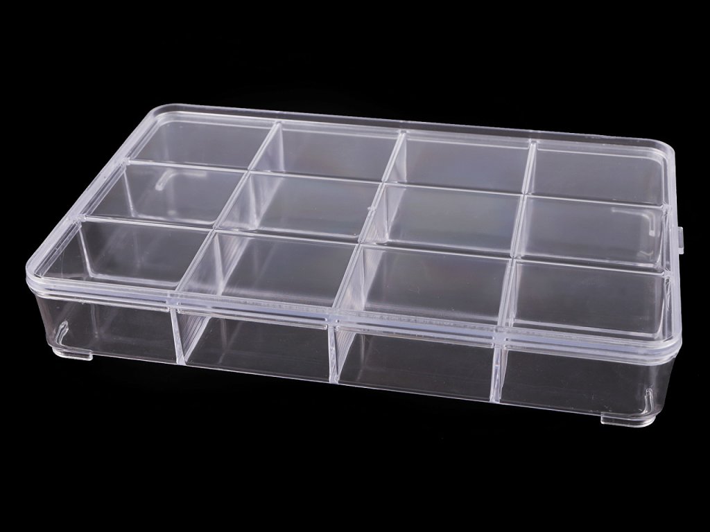 Krabička má 12 přihrádek o velikosti 46 x 55 mm. Je z tvrdého plastu se zavíracím víkem.