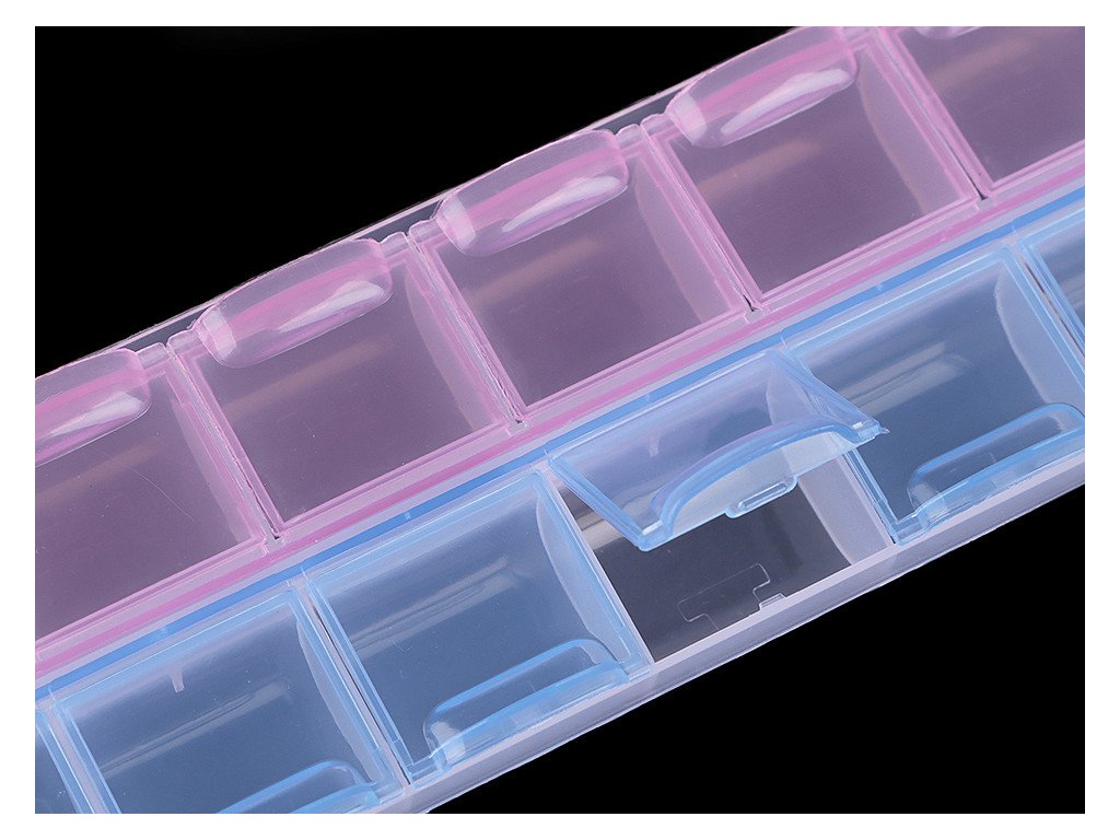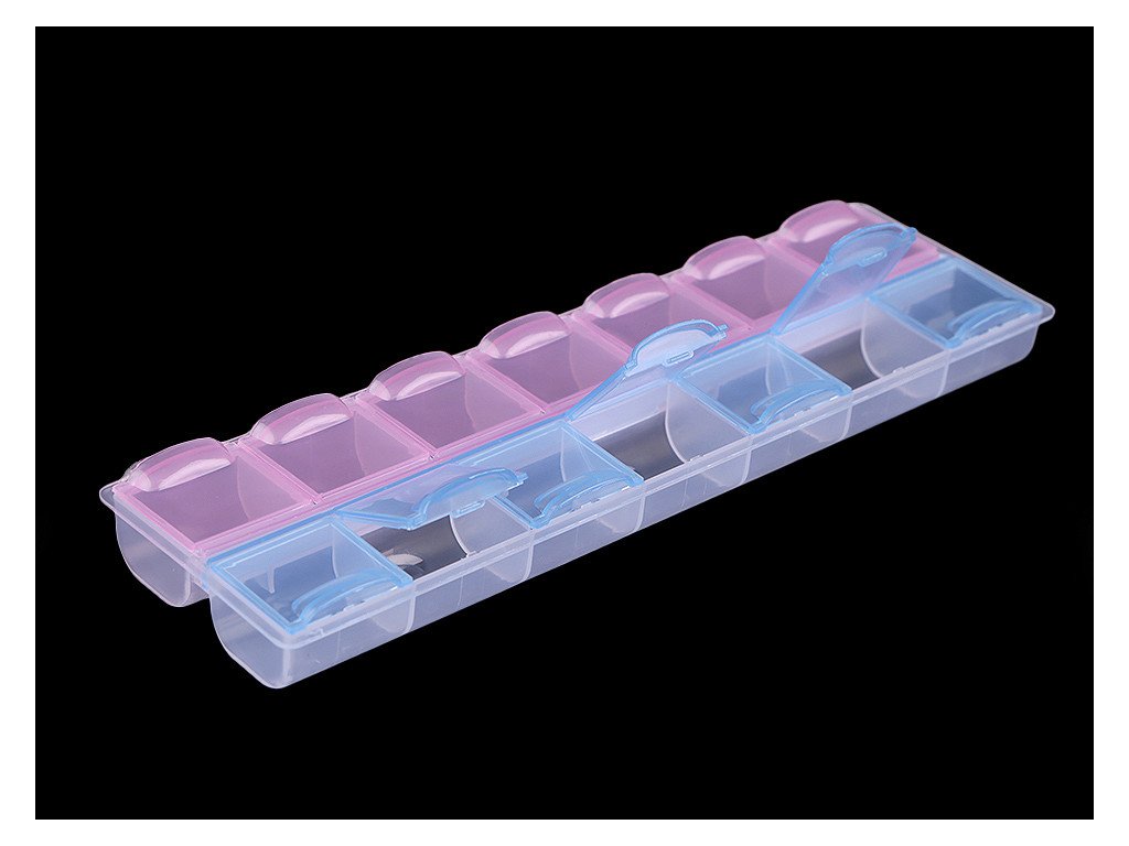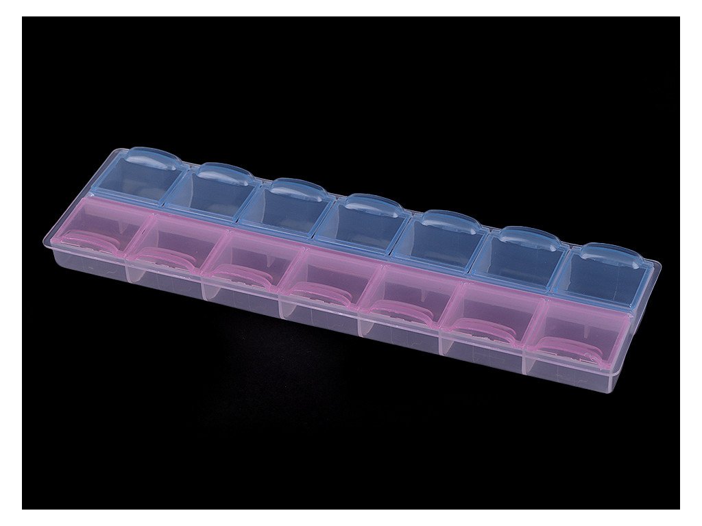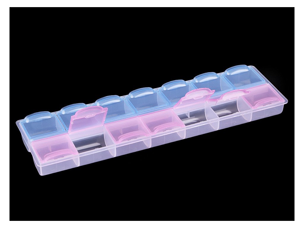 Krabička má 14 přihrádek o velikosti 24 x 28 mm.