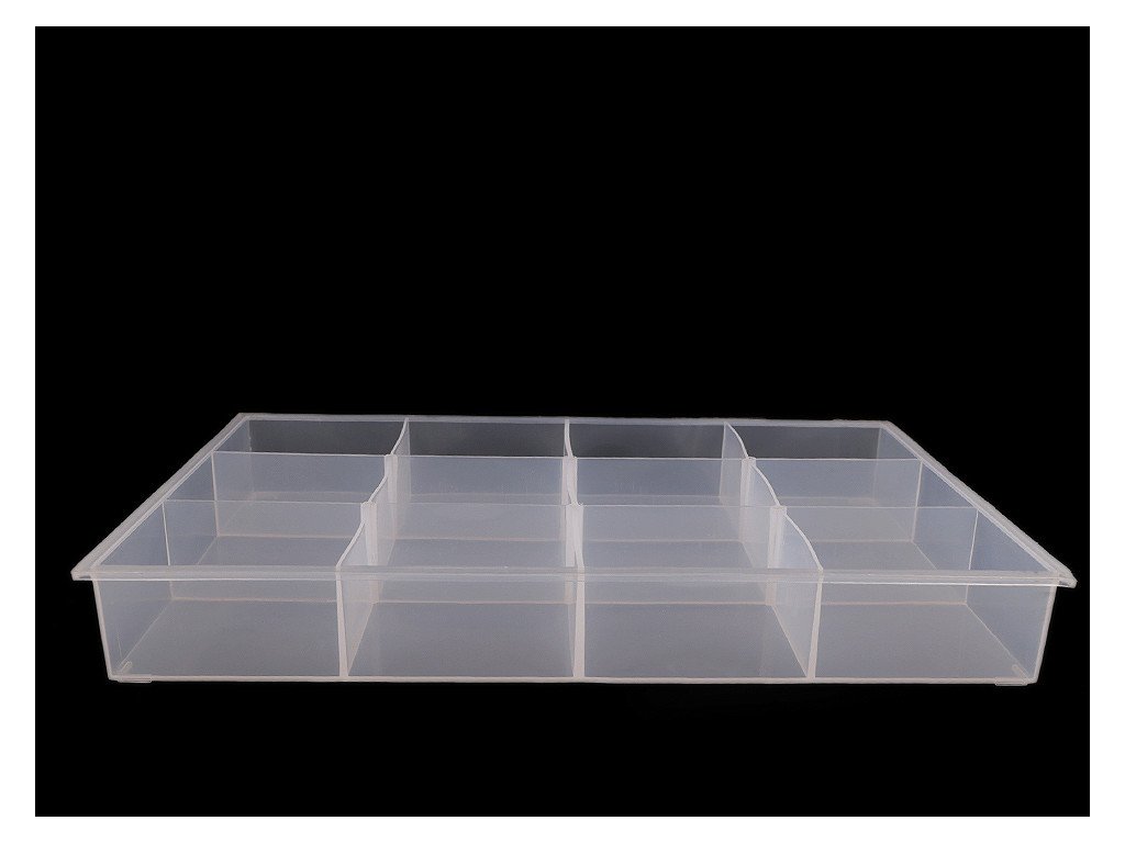 Transparentní zásobník se skvěle hodí na prezentaci přívěsků, korálků, kamenů, nití apod. Najde využití i jako organizér v domácnosti, do skříně, šuplíku apod.