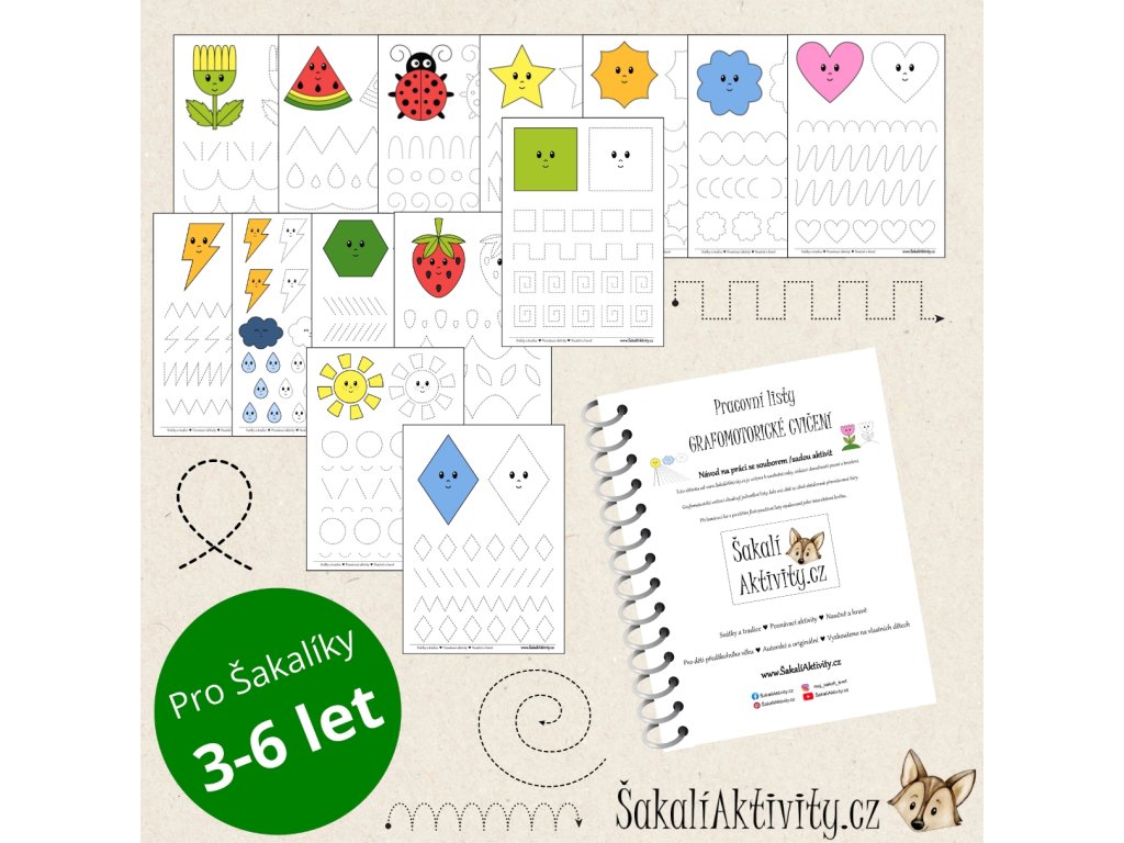 Tento soubor grafomotorických pracovních listů od ŠakalíAktivity.cz je ideálním pomocníkem pro děti, které se připravují na psaní. Uvolňovací cviky vedou k lepší koordinaci ruky, rozvoji jemné motoriky a osvojení základních tvarů, které dítě později využije při psaní písmen a číslic.