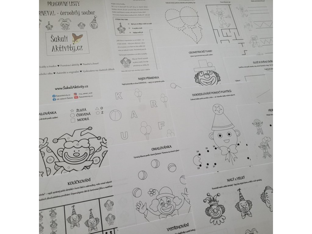 Karneval – pracovní listy (černobílý soubor) je tematicky zaměřený vzdělávací materiál určený pro děti v mateřských školách, školních družinách i při domácím vzdělávání. Soubor obsahuje 24 stran aktivit s tématikou karnevalu a masopustu, kterými děti provází veselí klauni a šašci. Díky černobílému zpracování je materiál ideální jak pro školní tisk, tak pro domácí použití, a zároveň je vhodný k laminaci a opakovanému využívání.