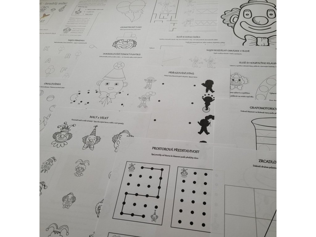 Děti se v souboru setkají s dokreslováním stejných tvarů, bludišti s klauny, grafomotorickými cvičeními zaměřenými na čáry, oblouky, cikcak a vlnky, hledáním stejných a rozdílných obrazců i kolíčkovými aktivitami s počty do 6. Součástí jsou také úkoly na dokreslování tvarů podle předlohy, zrcadlové kreslení do mřížky a seznámení s písmenem K včetně jeho obtahování.