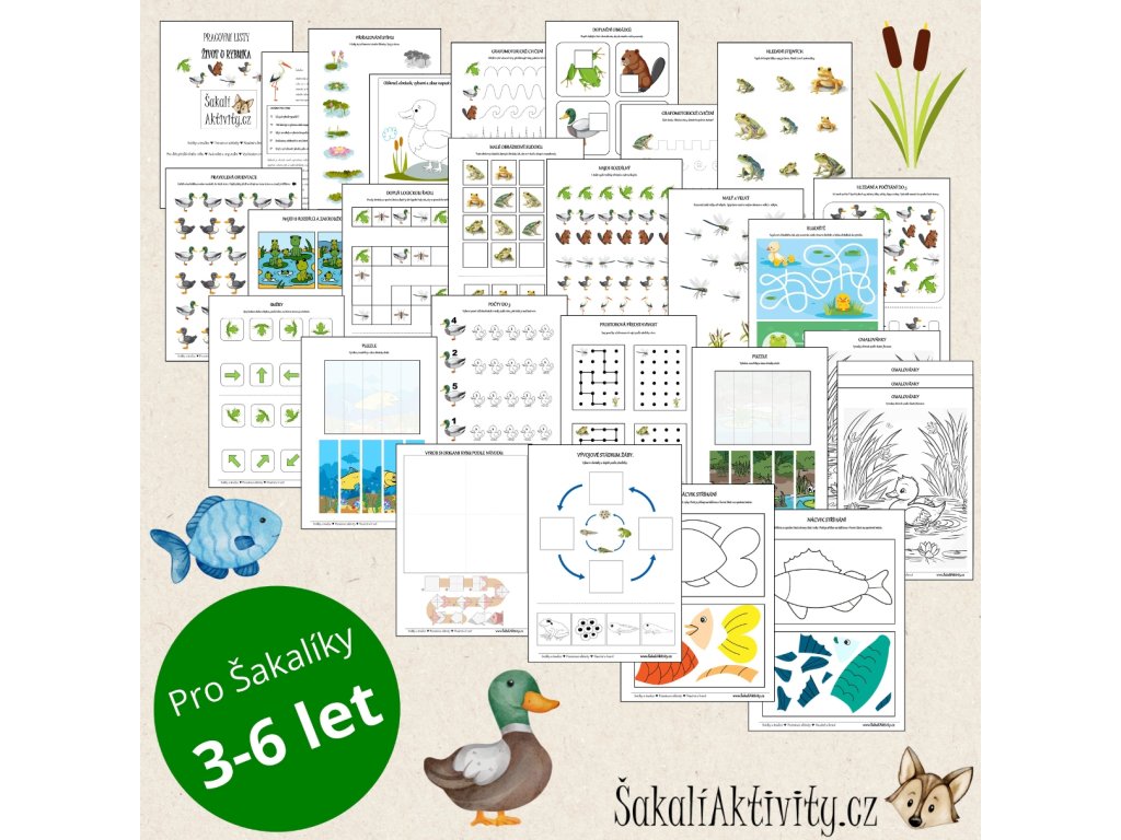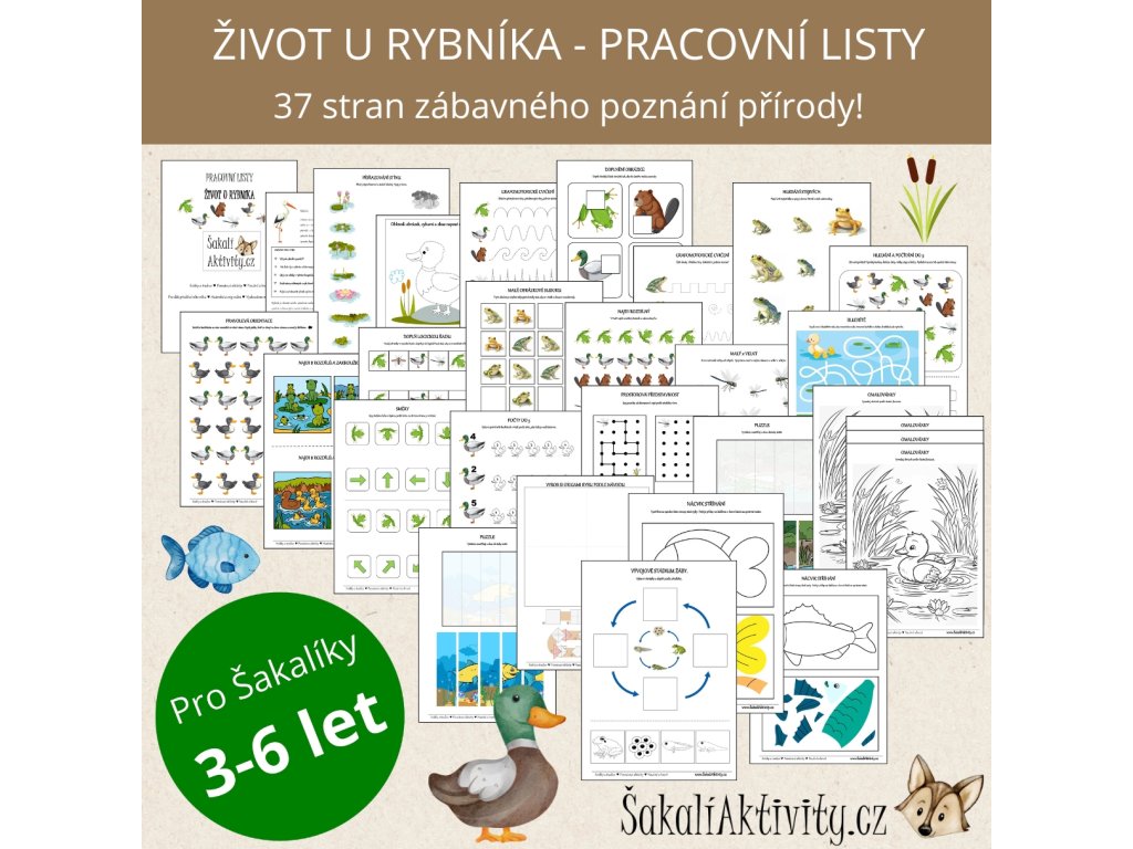Vydejte se s dětmi na dobrodružnou výpravu do světa rybníků a jejich obyvatel! Tento obsáhlý pracovní soubor od ŠakalíAktivity.cz nabízí 37 stran plných hravých a naučných aktivit, které přiblíží dětem život u vody. Společně poznáte živočichy i rostliny – čekají na vás lekníny, rákosí, vážky, ryby, žáby a mnoho dalších přírodních zajímavostí.