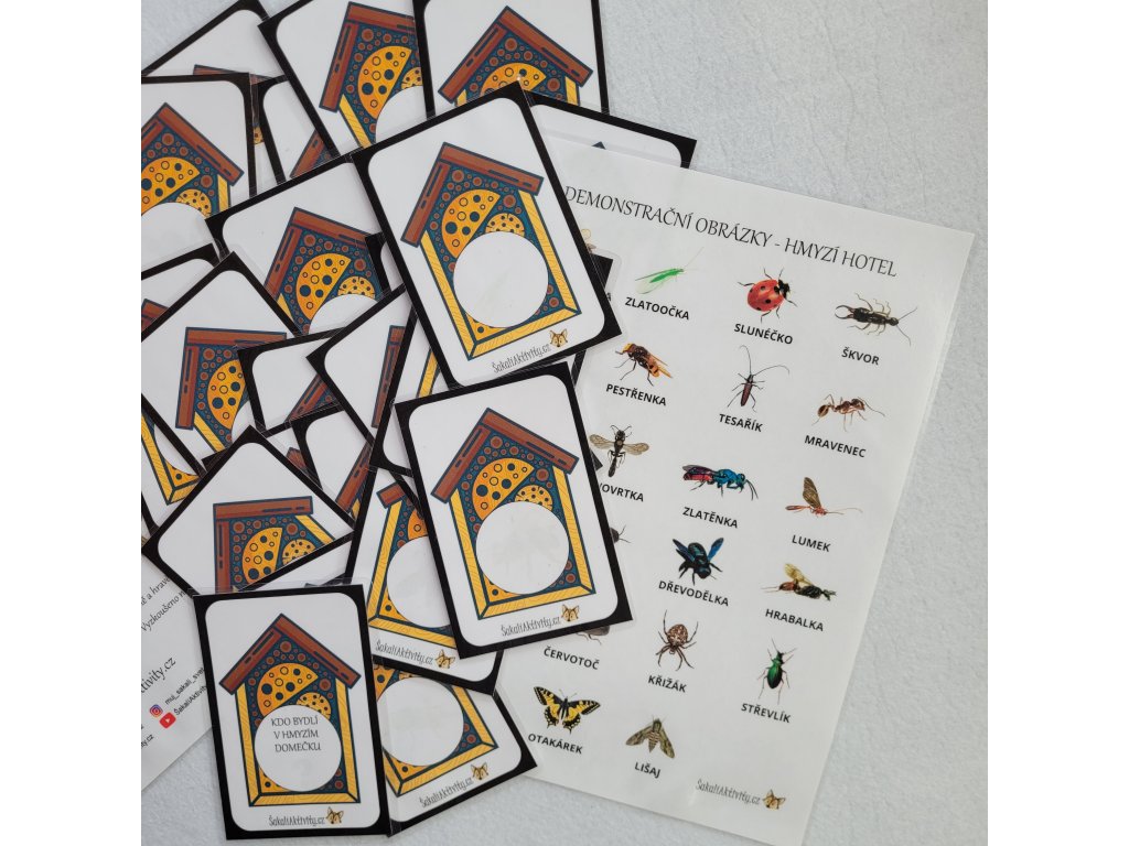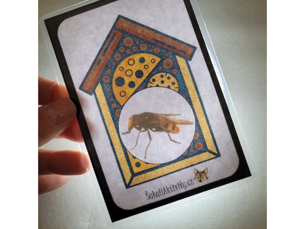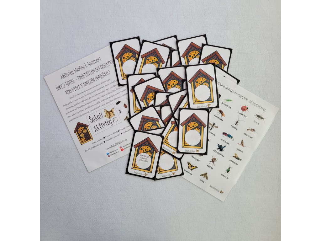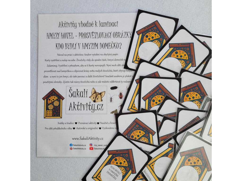 Soubor obsahuje 24 prosvětlovacích karet s ilustracemi hmyzích domečků. Na první pohled vypadají jako běžné obrázky, ale když na ně posvítíte lampičkou, baterkou nebo postavíte ke světlu od okna, odhalí se skrytý obyvatel – může to být hmyz, pavouček nebo jiný drobný tvor, který se rád ukrývá v dutinkách, šiškách nebo pod kůrou.