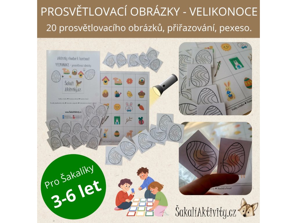 Tato originální smyslová aktivita od www.ŠakalíAktivity.cz přináší dětem radost z objevování a práce se světlem. Na první pohled obyčejné karty s obrázkem velikonočního vejce v sobě skrývají překvapení – po prosvícení se objeví typické velikonoční motivy.