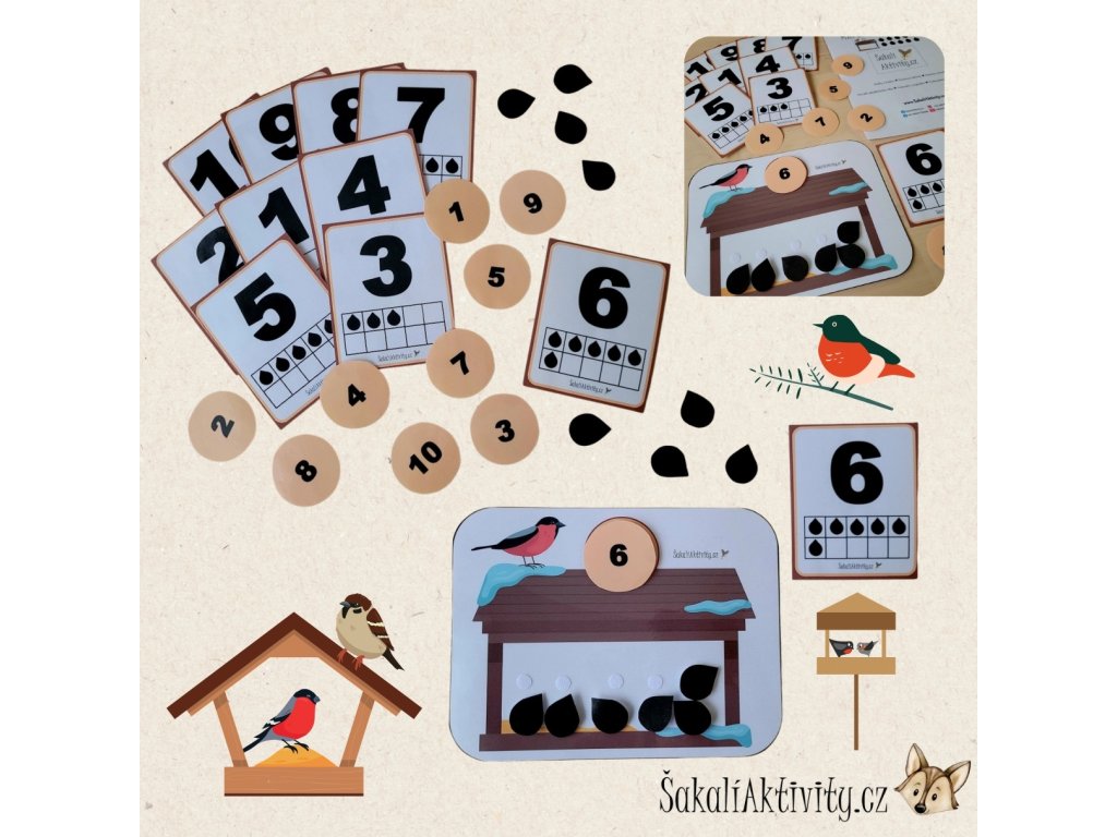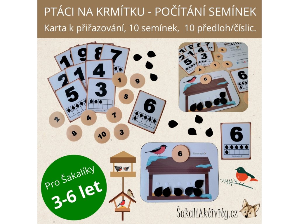 Soubor obsahuje hlavní kartu s obrázkem ptačí budky (krmítka), deset samostatných semínek k vystřižení a předlohové karty s číslicemi 1–10 graficky doplněné obrázky semínek. Na základě zadání dítě přikládá na krmítko správnou číslici a odpovídající počet semínek.