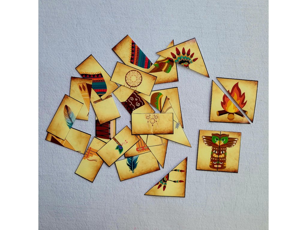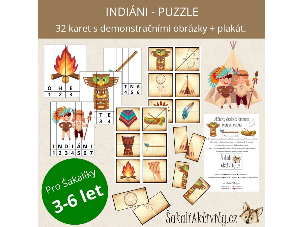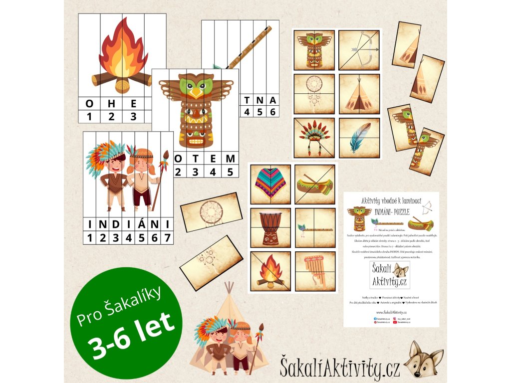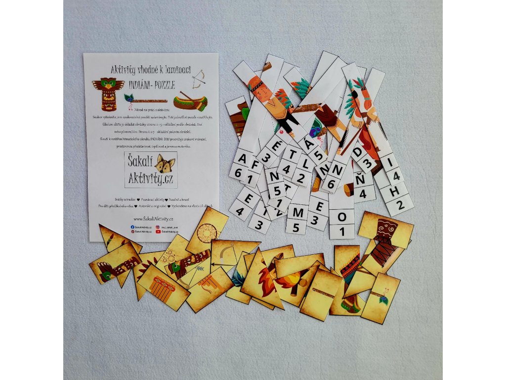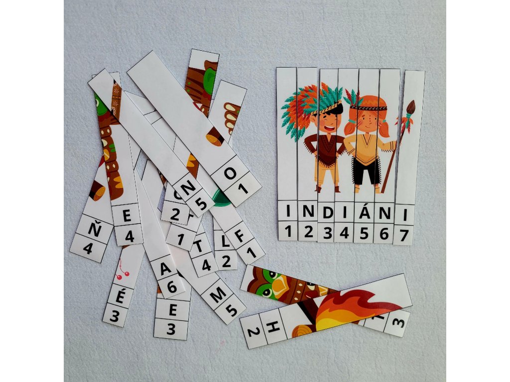 Tato tematická sada indiánských puzzlí je skvělou pomůckou pro nejmenší děti – podporuje logické myšlení, rozpoznávání tvarů, slov i čísel. Sada obsahuje celkem 16 jednoduchých skládaček, z toho 12 dvoudílných puzzlí s motivy indiánů. Vhodné pro témata - léto, indiáni,..