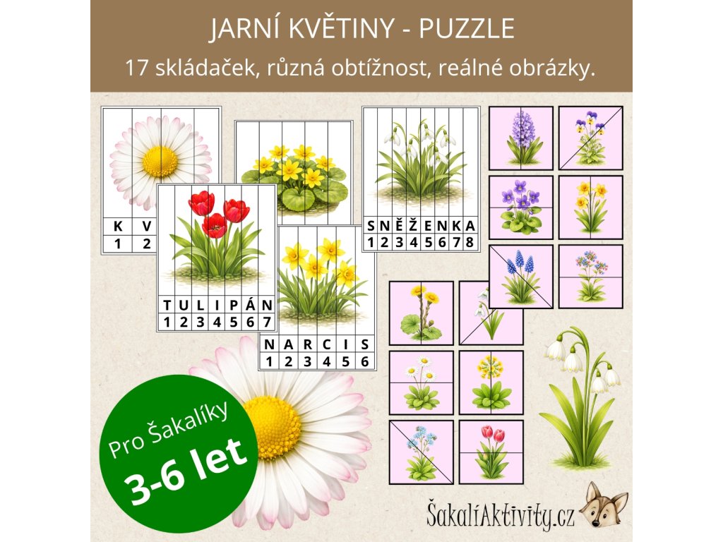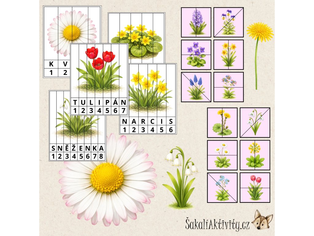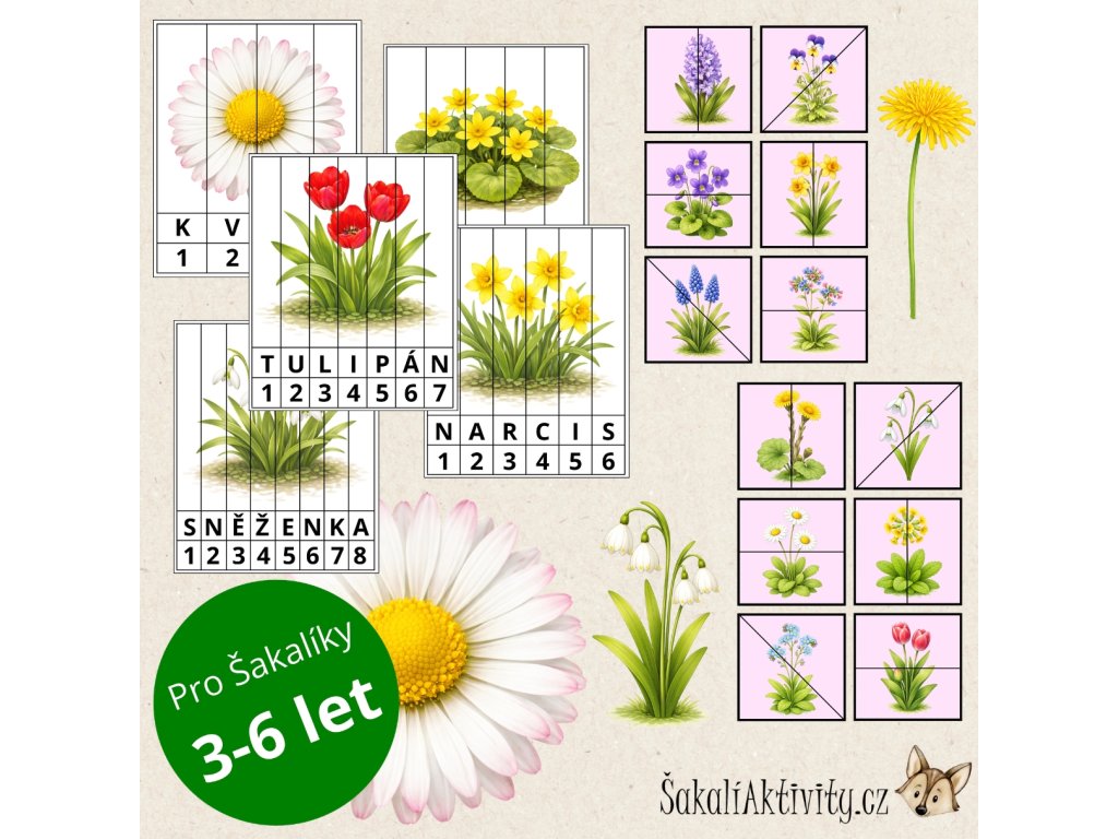 Soubor Puzzle – Jarní květiny je výukový a zábavný materiál určený dětem předškolního a mladšího školního věku. Prostřednictvím skládání puzzlí se děti seznamují s prvními jarními květinami a učí se poznávat jejich názvy i vzhled.