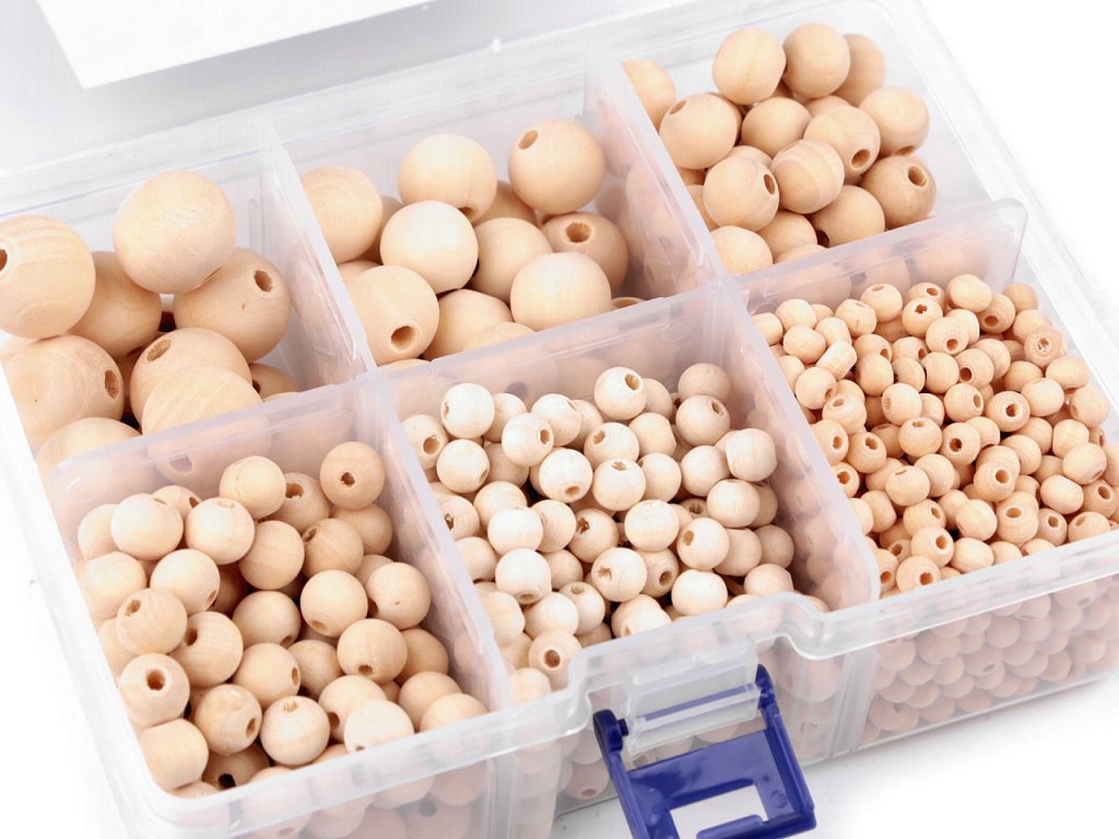 Sada dřevěných korálků v praktickém boxu potěší malé i velké korálkářky.