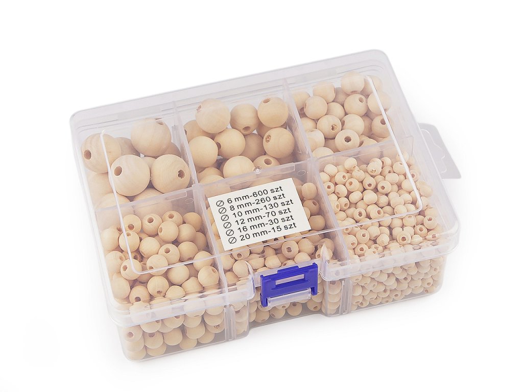 Box je rozdělený na 6 přihrádek. Obsahuje korálky o Ø6, 8, 10, 12, 16 a 20 mm. Dohromady obsahuje cca 1100 ks korálků.