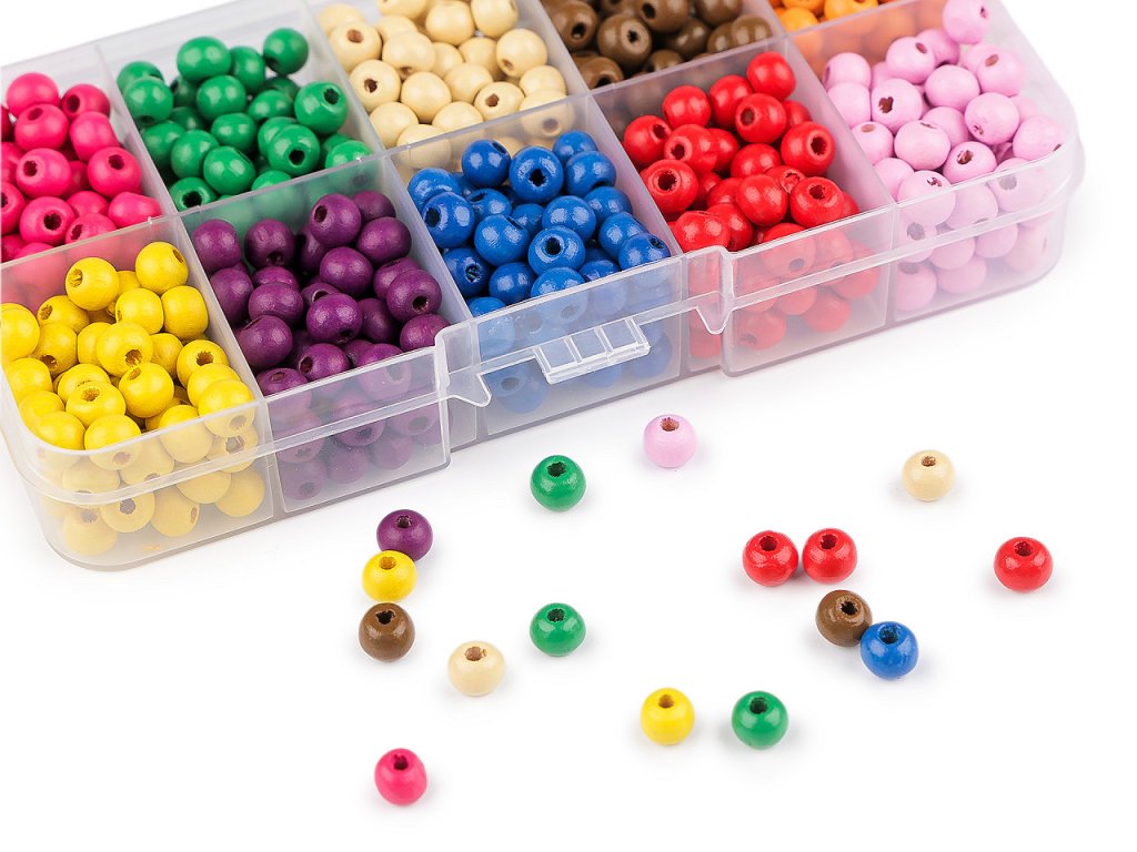 Sada dřevěných korálků v boxu