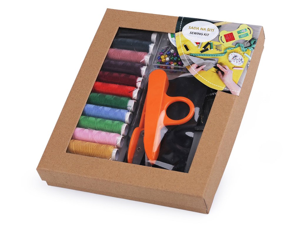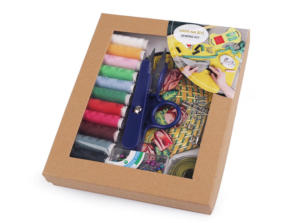 Obsah varianty č. 1: - 12 cívek nití různých barev - krabičku špendlíků s plastovými hlavičkami - svazek 12 spínacích špendlíků ve 3 velikostech (3, 4, 5 cm) - cvakačky - oboustranný krejčovský metr (150 cm) v plastové krabičce - 9 jehel ve velikosti 42 - 50 mm,10 ks jehel ve velikosti 30 - 40 mm, 1 navlékač nití v papírovém košíčku Obsah varianty č. 2: - 12 cívek nití různých barev - krabičku špendlíků s plastovými hlavičkami - svazek 12 spínacích špendlíků ve 3 velikostech (3, 4, 5 cm) - cvakačky - oboustranný krejčovský metr (150 cm) v plastové krabičce - 30 ks jehel Krabička má rozměry: 3 x 16,5 x 19,5 cm.
