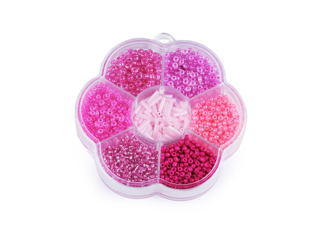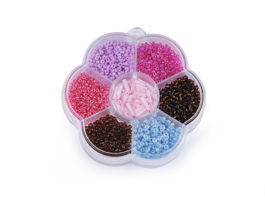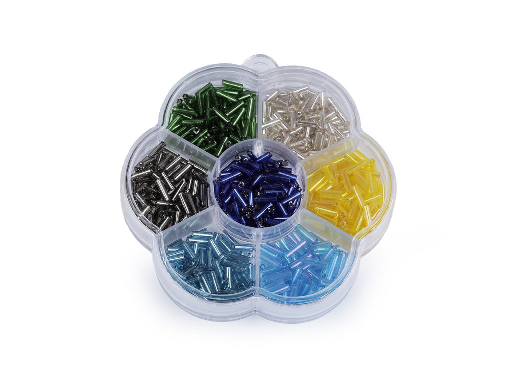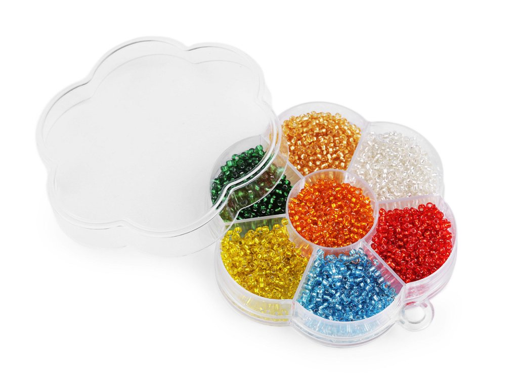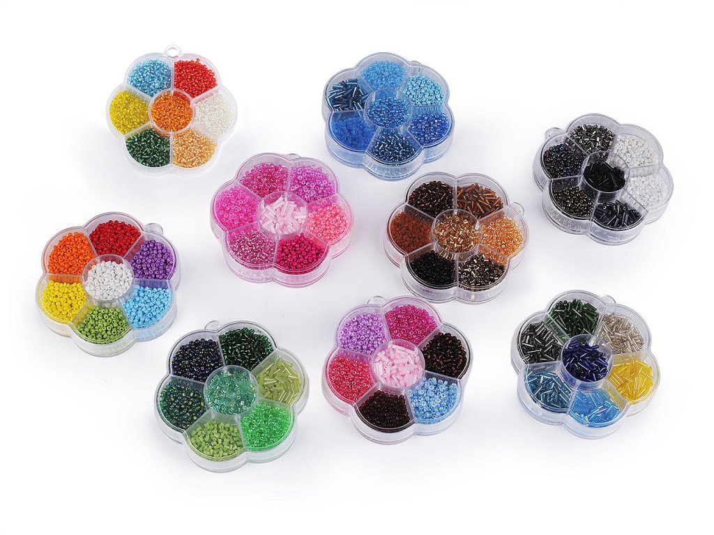 Plastový box ve tvaru květu obsahuje barevný mix skleněného rokajlu a tyček.