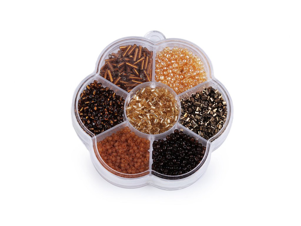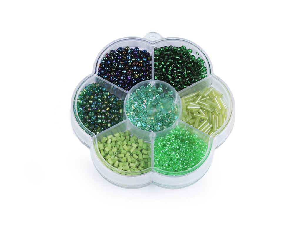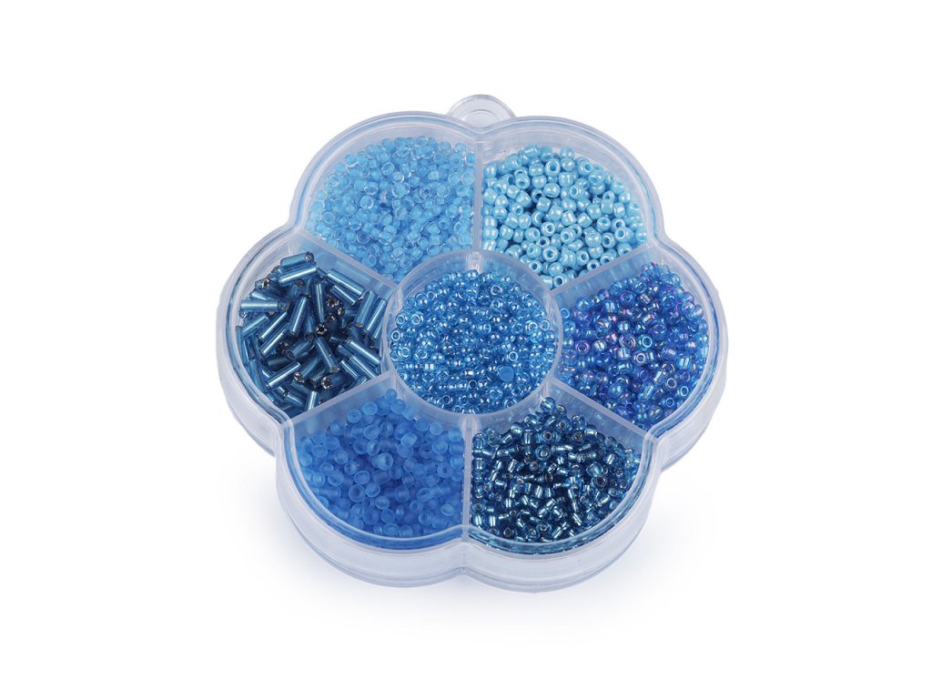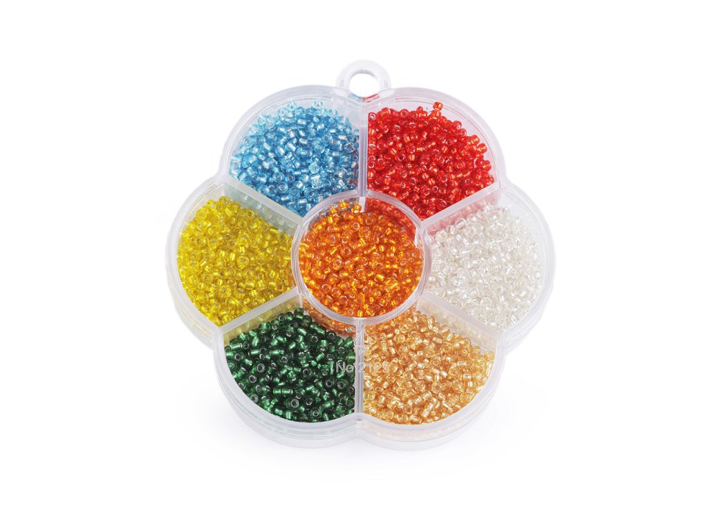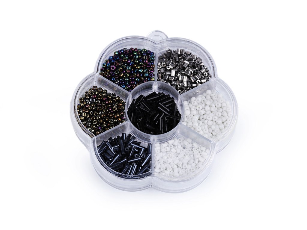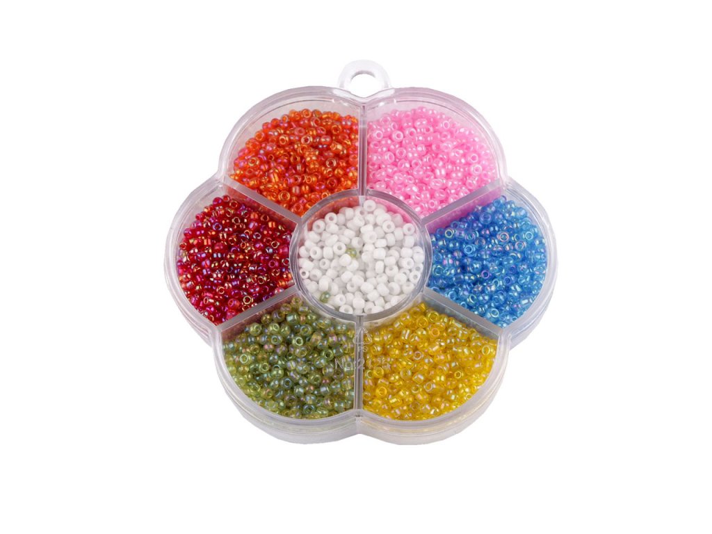 Plastový box ve tvaru květu obsahuje barevný mix skleněného rokajlu a tyček.
