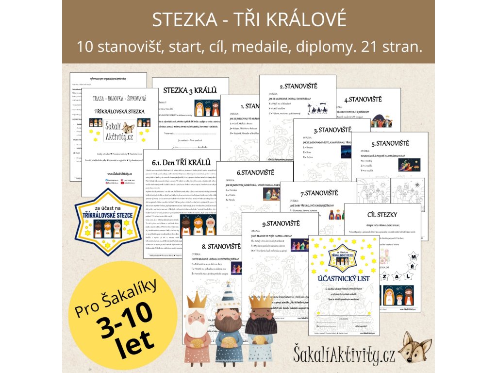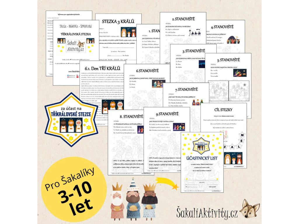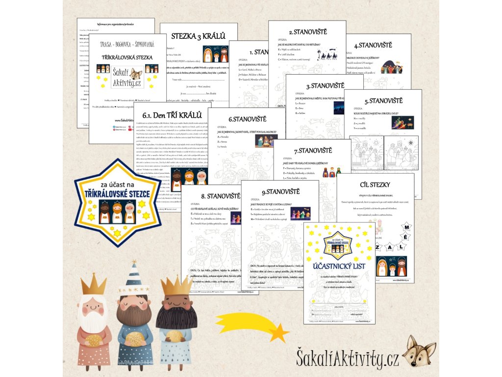 Součástí souboru jsou úvodní a závěrečná cedulka ke hře, karty s úkoly na jednotlivá stanoviště a karty pro zapisování odpovědí. Stezka je ideální jako zimní aktivita, projektový den nebo tematická hra k tradici Tří králů.