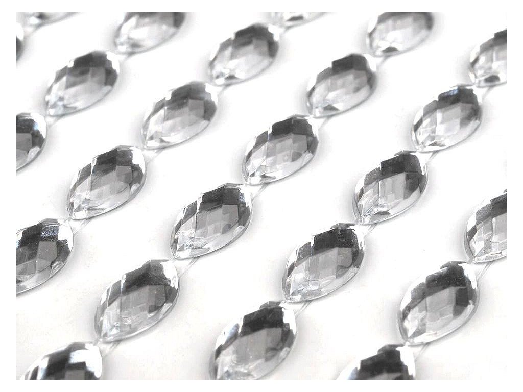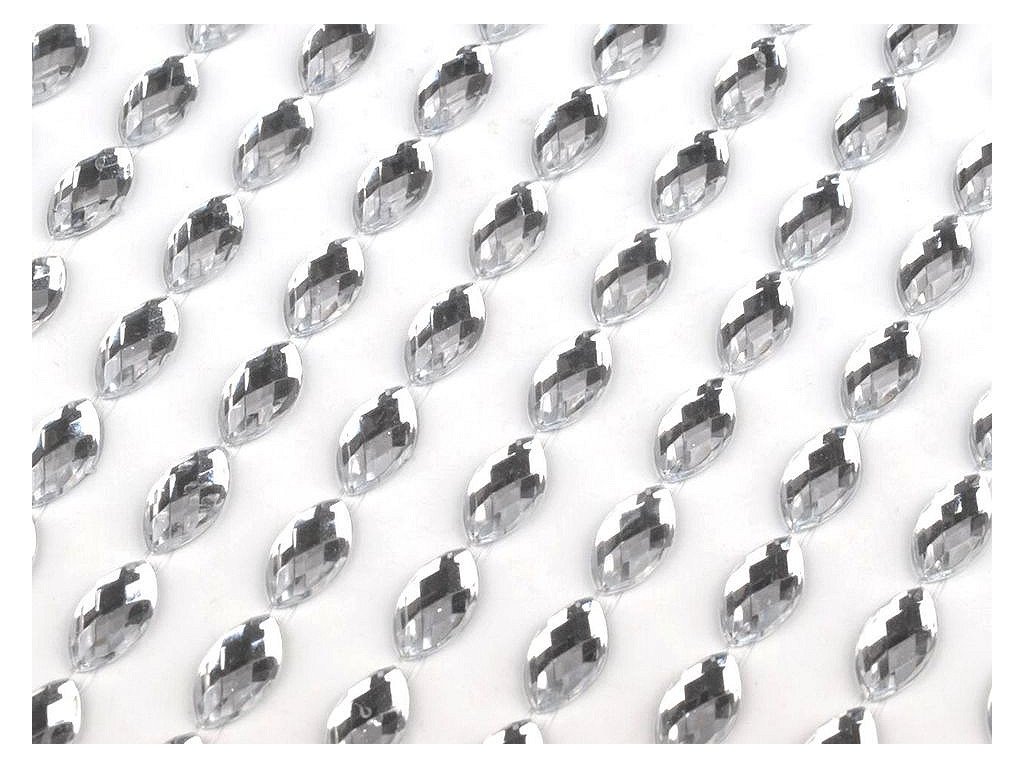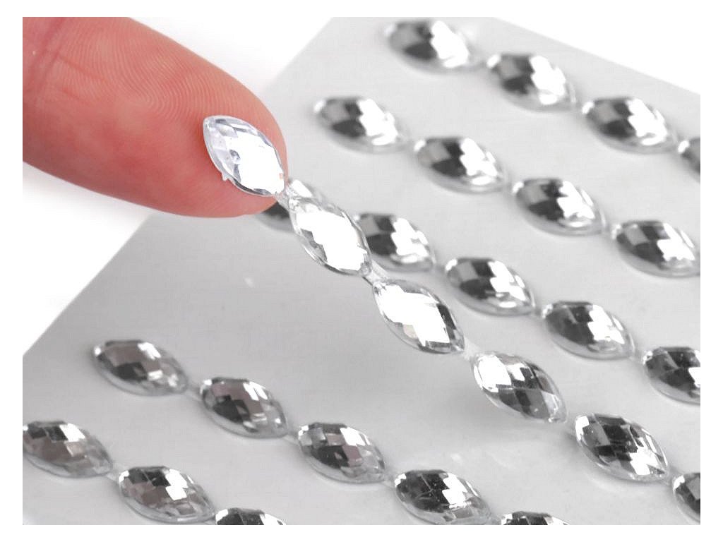 Samolepicí broušené kamínky ve tvaru navetky jsou vhodné na scrapbooking. Všechny jsou nalepené na jednom archu podkladové folie, ze které je stačí sejmout.