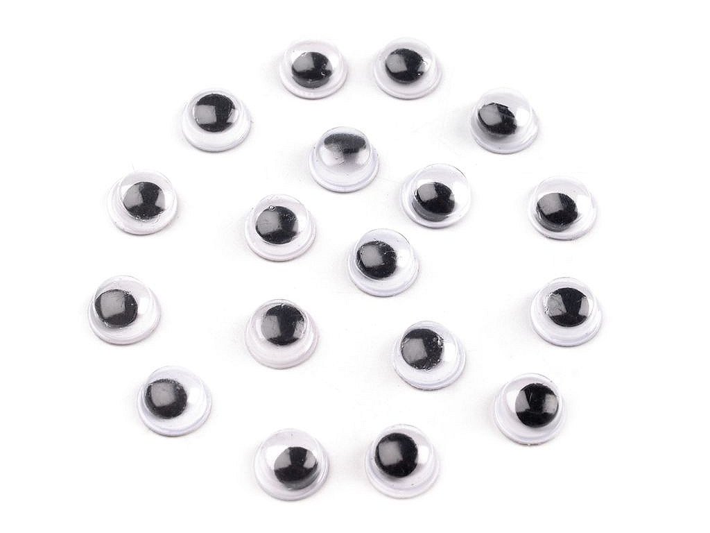 Černá čočka je pohyblivá. Spodní strana je opatřená samolepicí fólií. Nalepení očí je snadné. Odlepte spodní krycí papír a oči přilepte na suchý, čistý, pevný povrch.