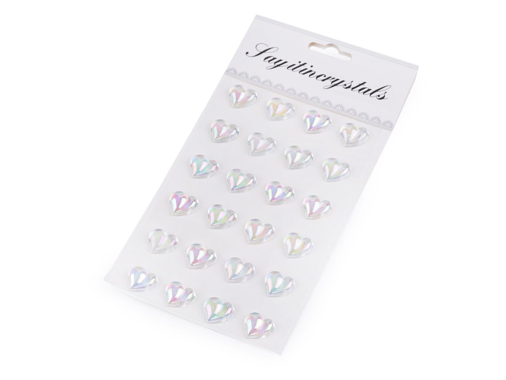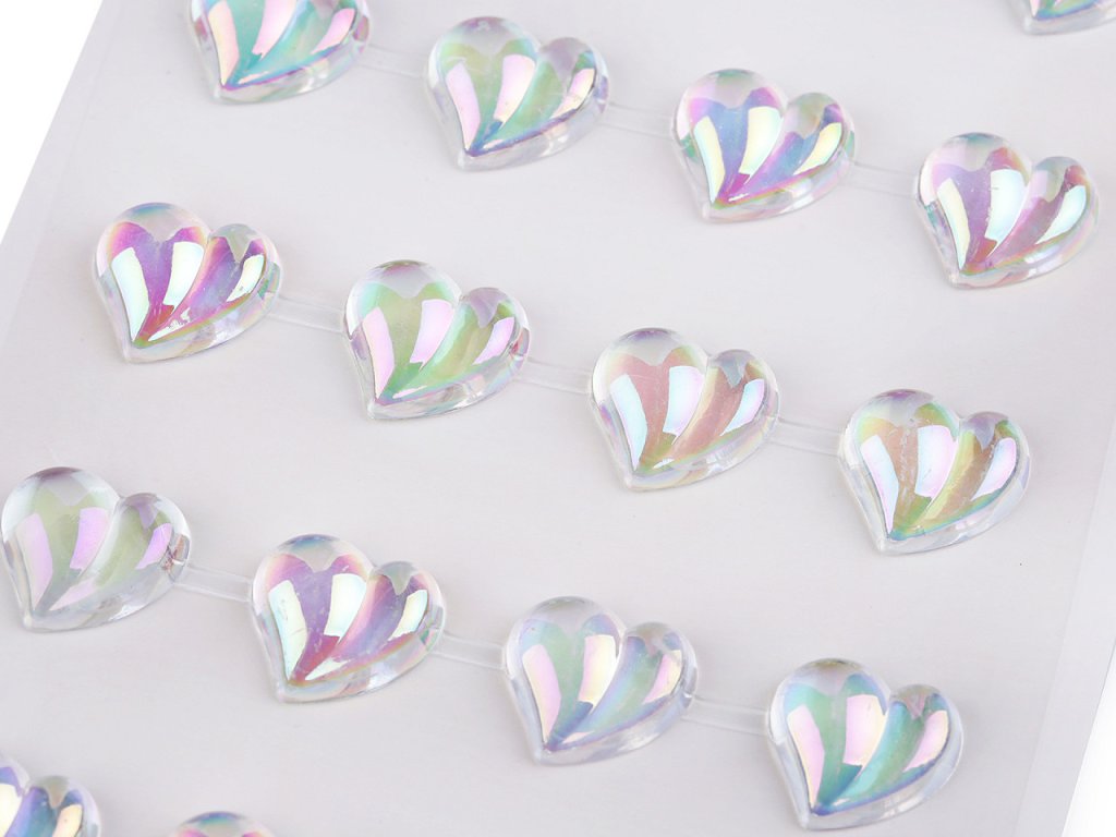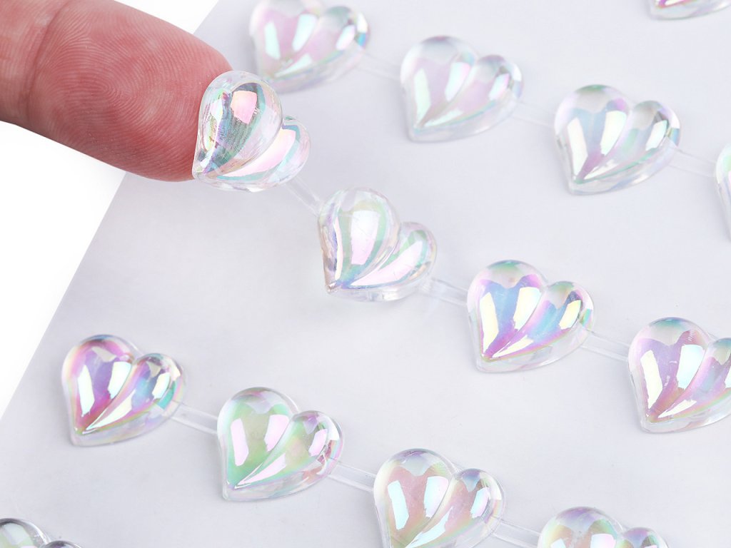 Kamínky ve tvaru srdcí jsou velice poutavé, mají vysoký lesk s AB efektem. Všechny jsou nalepené na jednom archu podkladové folie, ze které je stačí sejmout. Srdíčka jsou v řadách navzájem spojená lepícím proužkem, takže tvoří pásky.