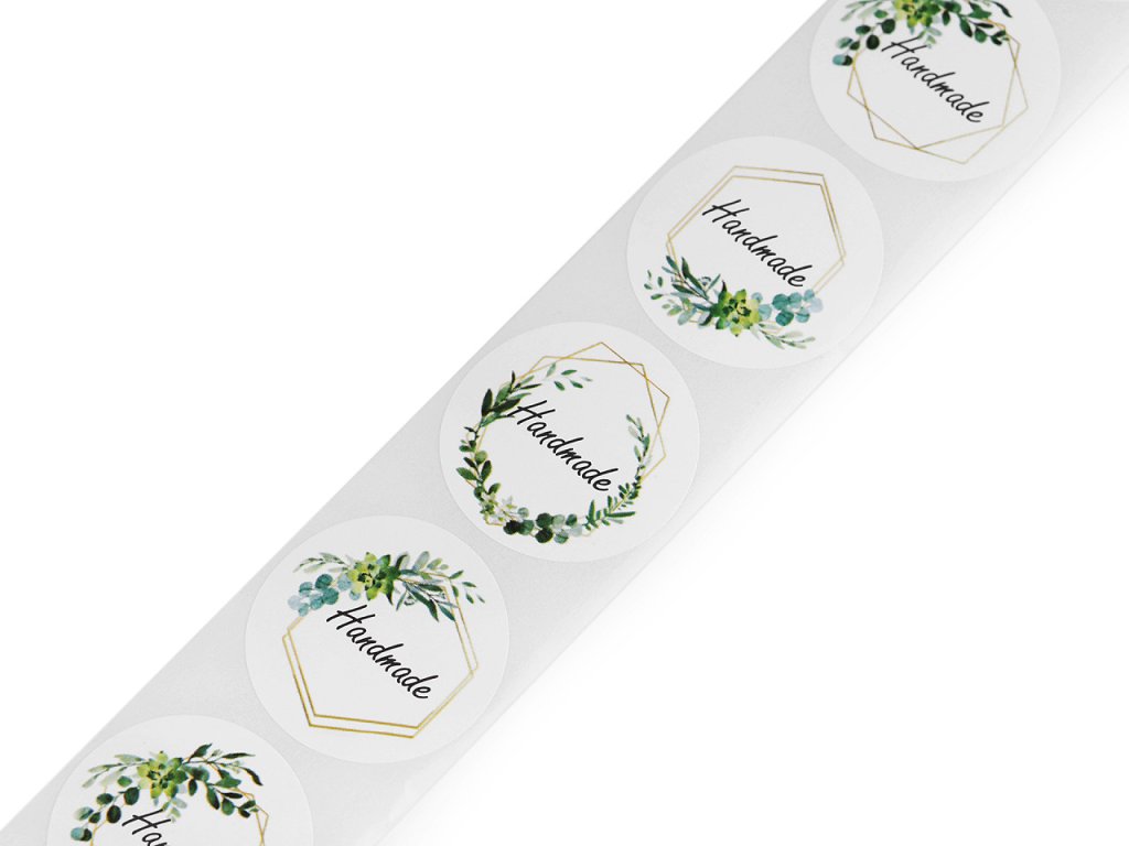 Kulaté samolepky zdobí nápis "Handmade". Využijete je na zdobení dárků, přáníček, deníků, foto rámečků, alb, pozvánek, krabiček apod.