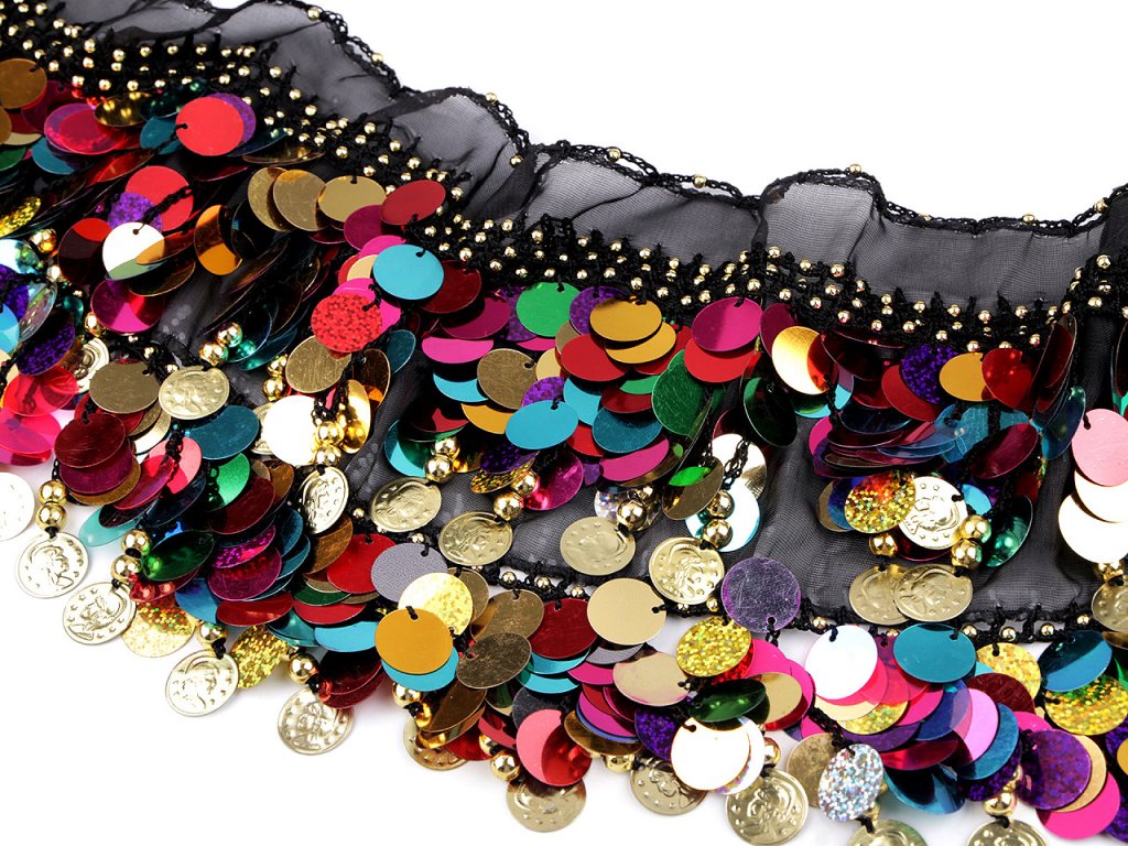 Při tanci vytváří úžasné efekty, upoutá svým jemným cinkáním a odlesky, které mu propůjčují velké barevné flitry. Hodí se na sukně i kalhoty.