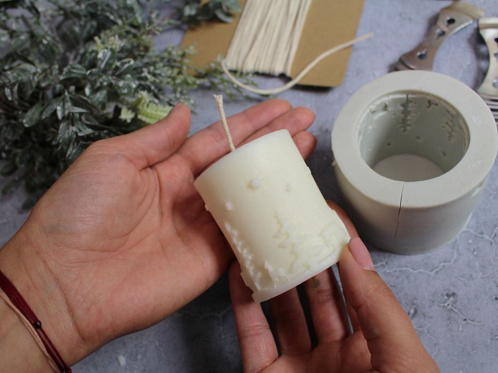 Po odlití svíčky je spoj na svíčce neviditelný. Rozměry hotové svíčky jsou cca 5,5 x 6,5 cm.