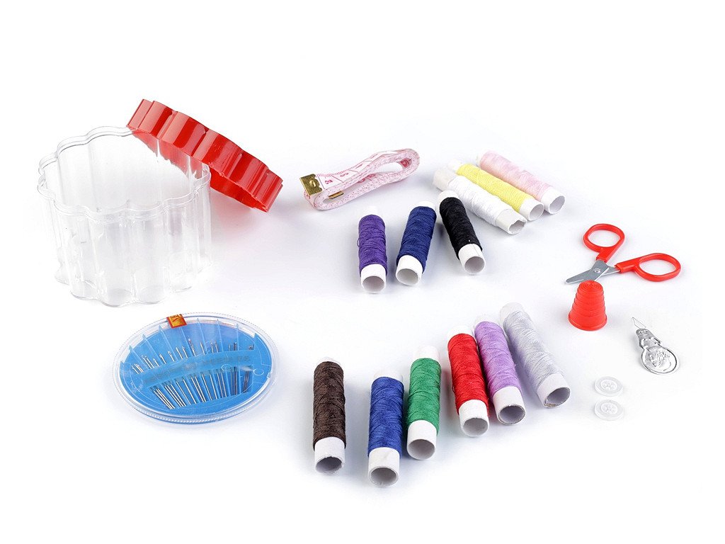 Obsah sady: - barevné nitě (12 ks) - kompaktní balení jehel v plastové krabičce - oboustranný krejčovský metr (150 cm) - navlékač nití - plastový náprstek - knoflíky - malé nůžky Barva nití a jehelníčku se může lišit.