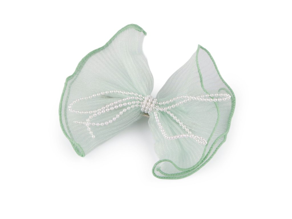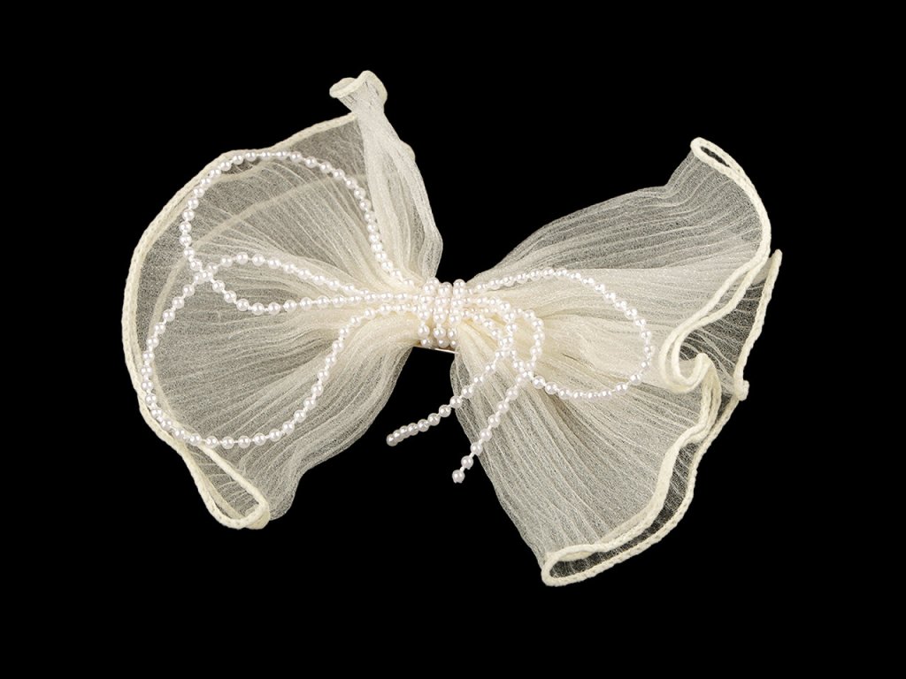 Velká spona s textilní mašlí nádherně ozdobí účes na všední den i slavnostní událost. Mašle je elegantní, ozdobená perlovým řetízkem.