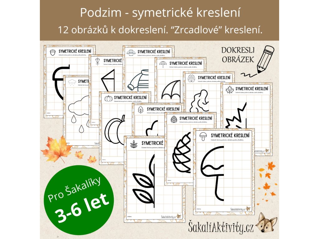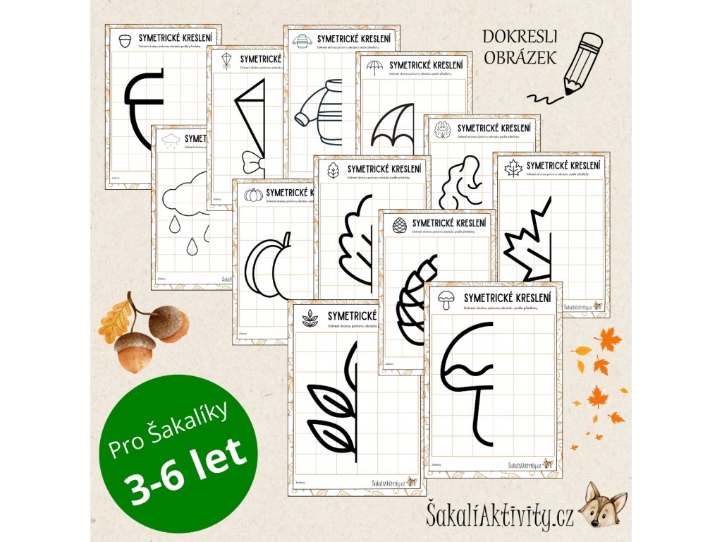 Dítě má za úkol dokreslit druhou polovinu obrázku podle předlohy vlevo tak, aby vznikl celý symetrický obraz. Každý list obsahuje půlku obrázku a dítě pracuje se zrcadlovou představou.