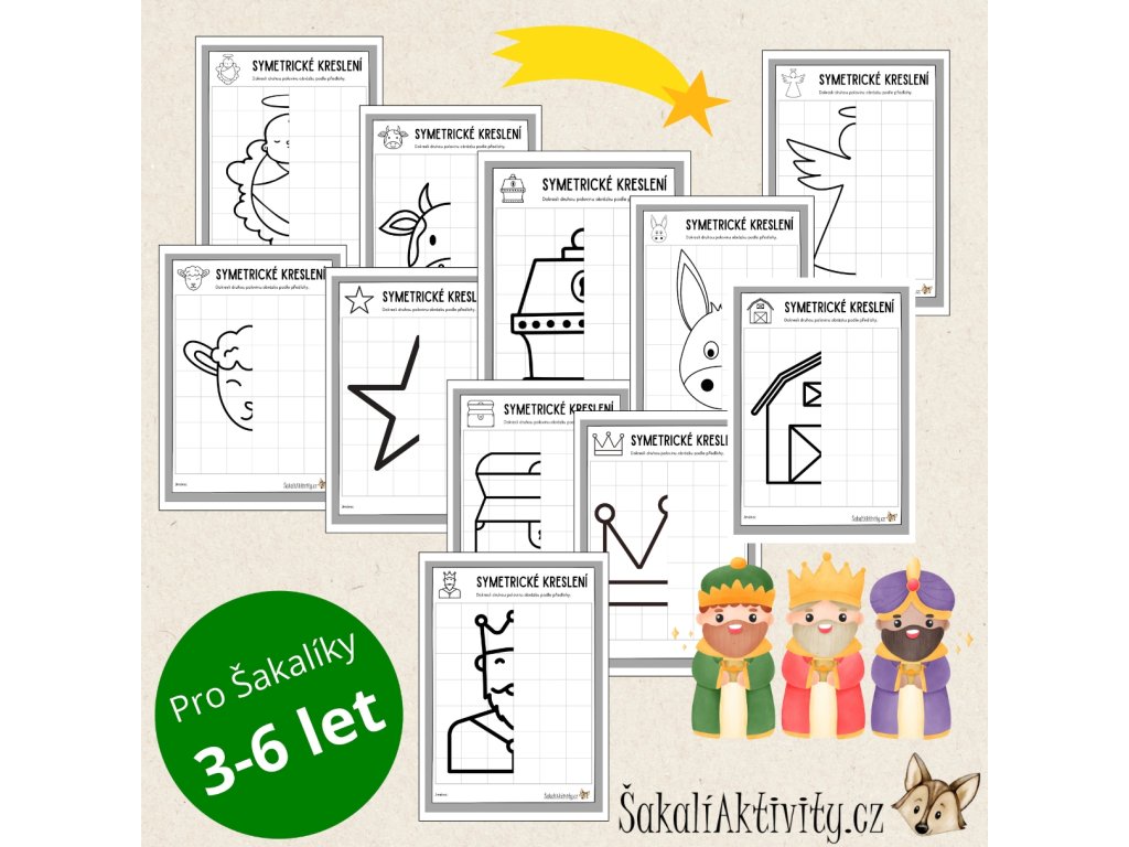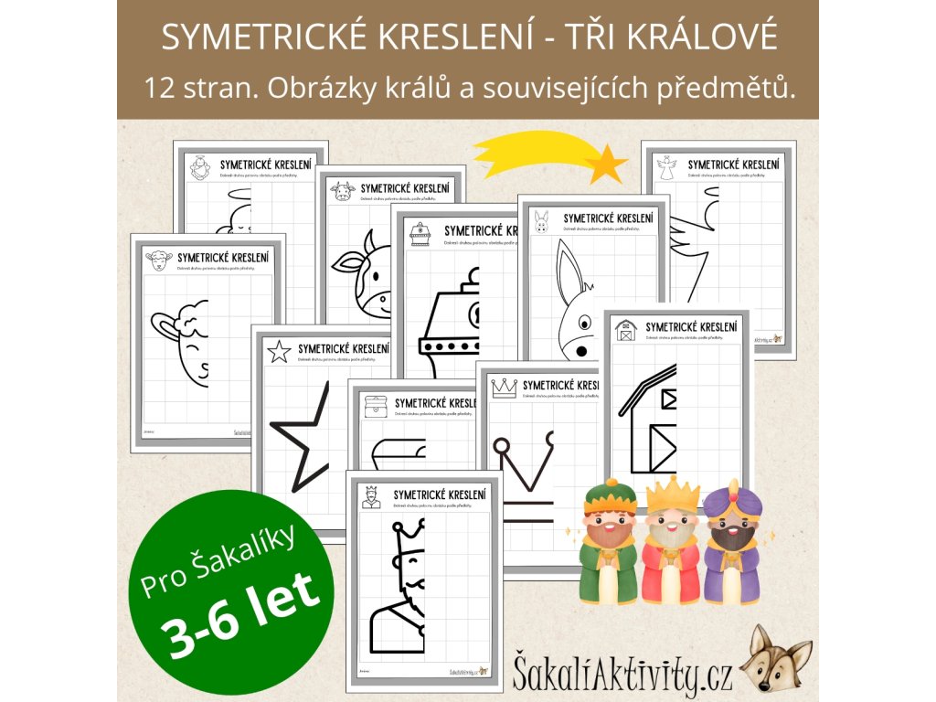 11 symetrických obrázků s tematikou Tří králů: koruna, Ježíšek, truhlice s dary, betlémská zvířátka, hvězda, králové a další.