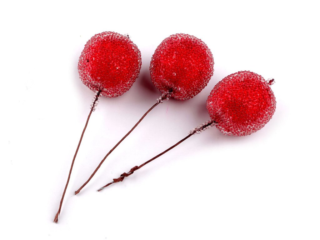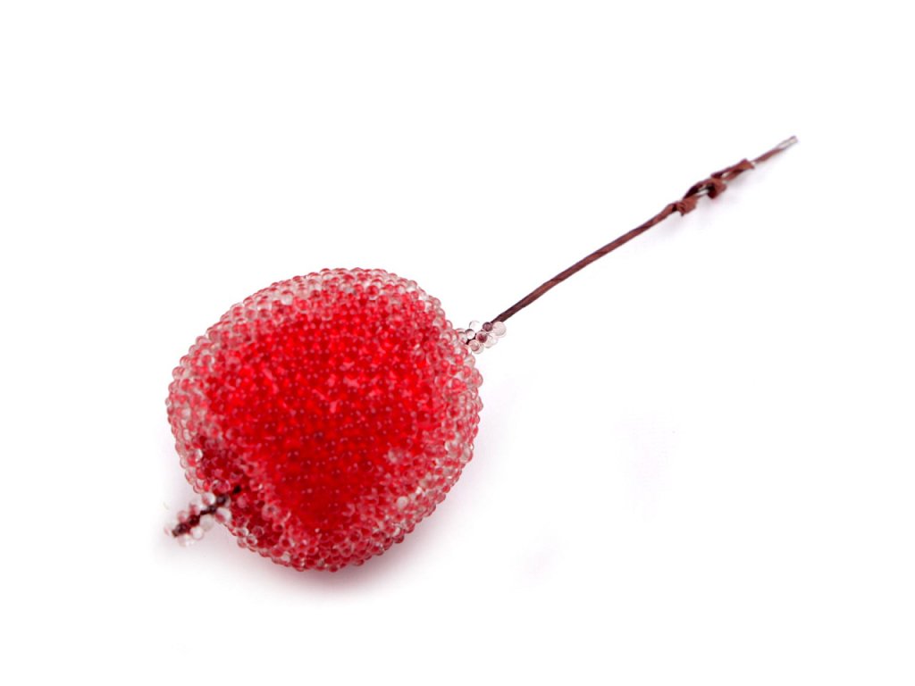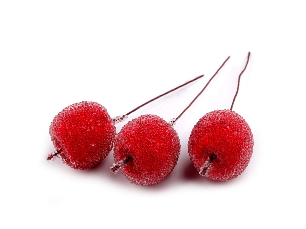 Dekorační jablíčka mají na povrchu drobné transparentní kuličky, které působí jako led.