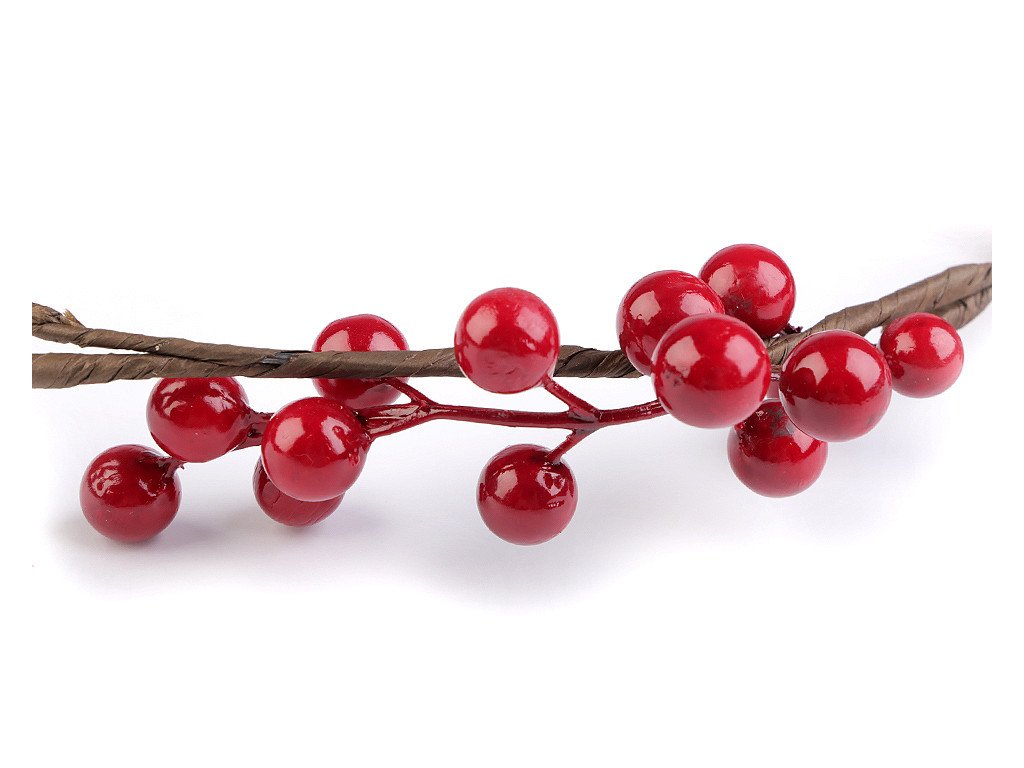 Dekorační jeřabiny z polystyrenu jsou připevněny na plastovou větvičku.
