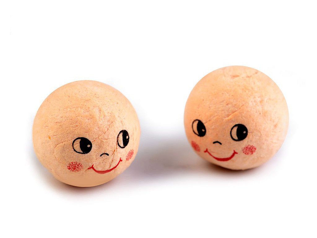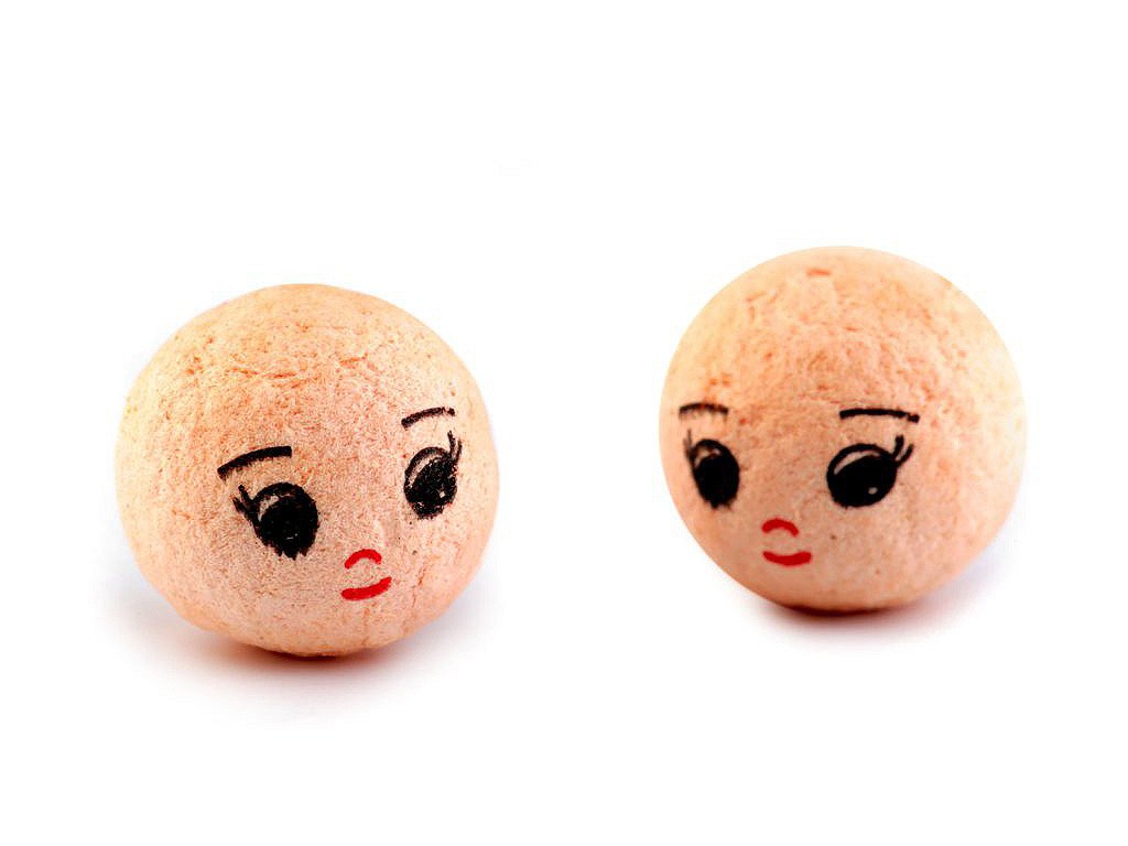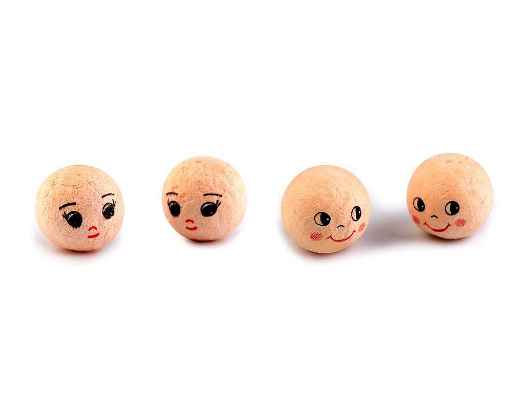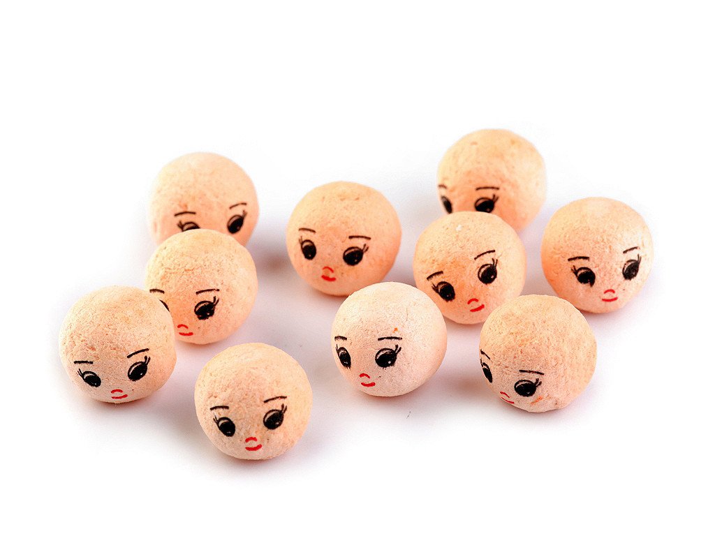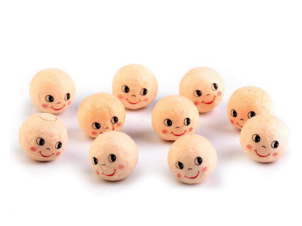 Vatovou hlavičku s natištěným obličejem využijete na výrobu různých postaviček, panenek, loutek, maňásků apod. Hlavička má zespodu malý otvor, do kterého můžete zapíchnout špejli či drátek a umístit například do květináče. Hlavičky jsou tvrdé, nemění tvar. Nevhodné pro děti do 3 let.- Průměr: 18 mm