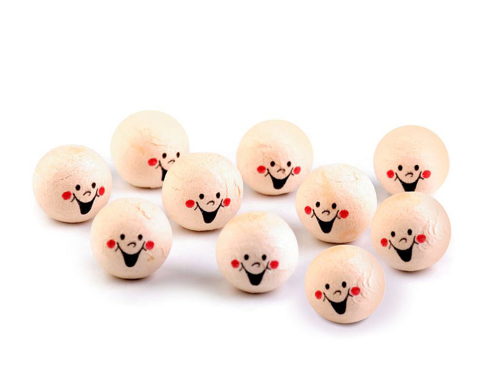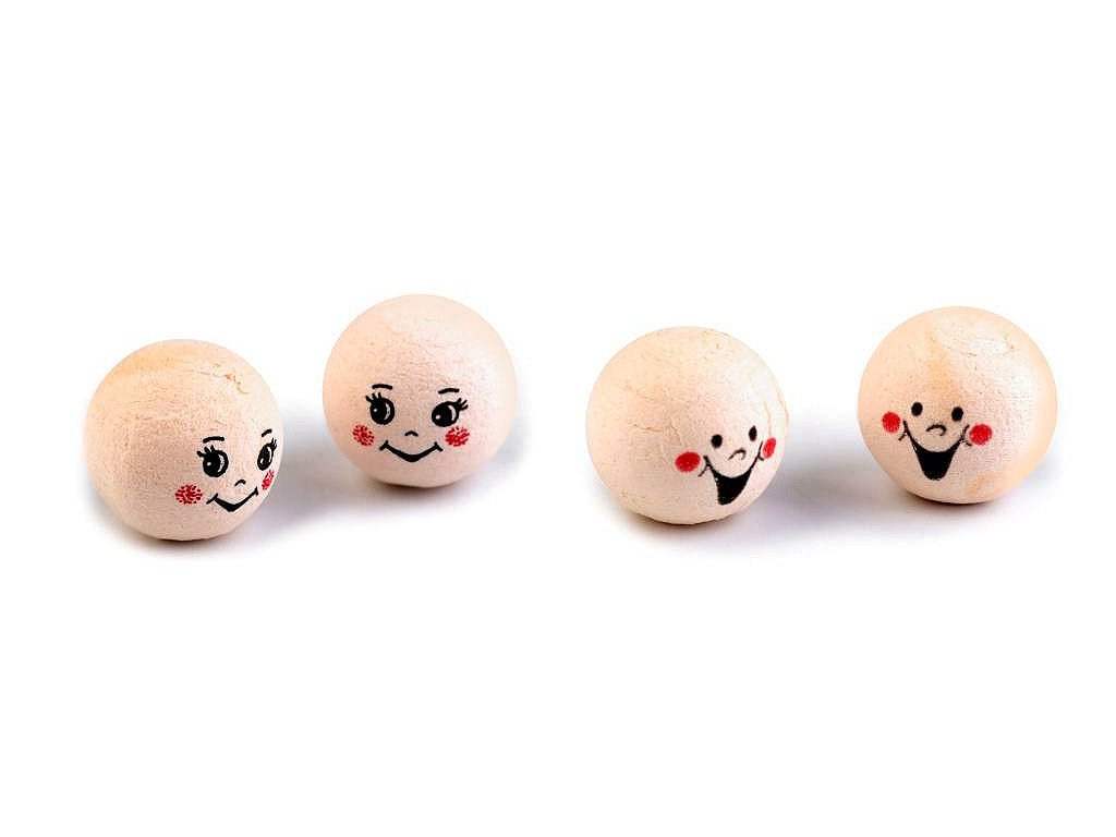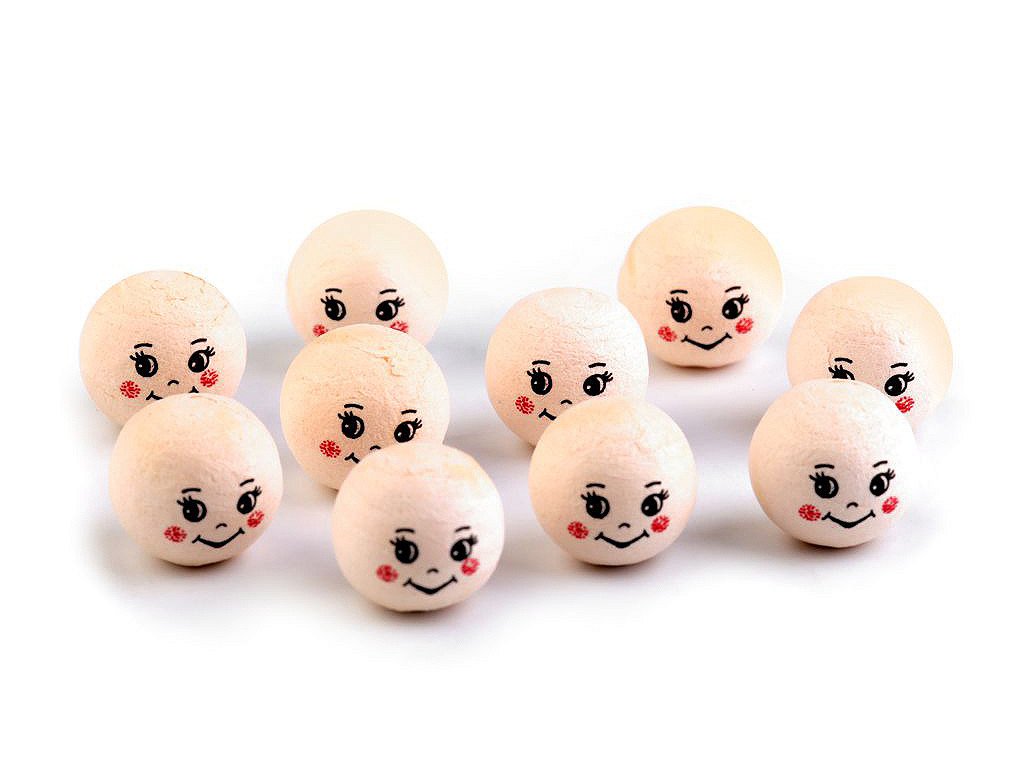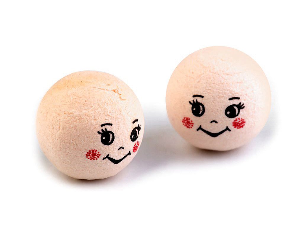 Vatovou hlavičku s obličejem využijete na výrobu různých postaviček, panenek, loutek, maňásků apod. Hlavička má zespodu malý otvor, do kterého můžete zapíchnout špejli či drátek a umístit například do květináče. Hlavičky jsou tvrdé, nemění tvar. Nevhodné pro děti do 3 let.- Průměr: 22 mm