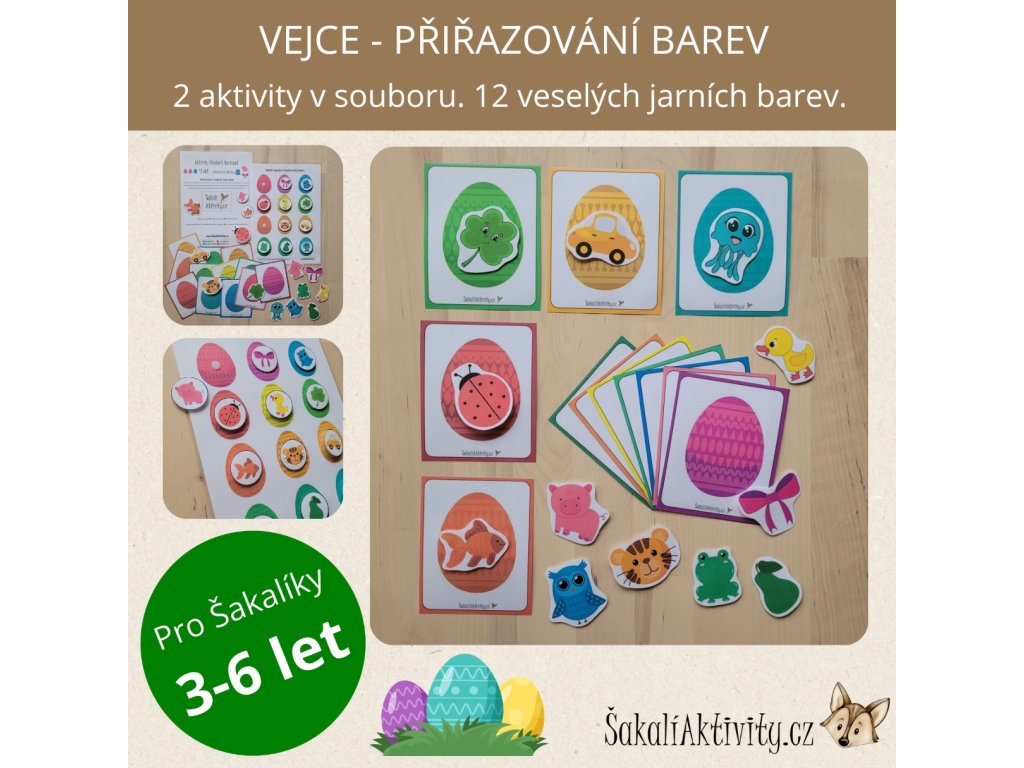 Soubor Vejce – přiřazování barev je hravá vzdělávací aktivita pro děti ve věku přibližně 2–6 let. Pomocí veselých velikonočních motivů si děti procvičují rozpoznávání barev, třídění obrázků a jemnou motoriku. Aktivita je ideální pro mateřské školy, centra aktivit, stolečkové úkoly i domácí učení.