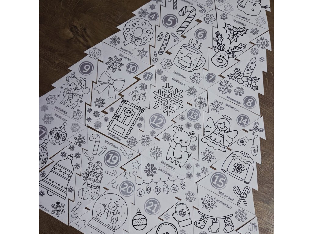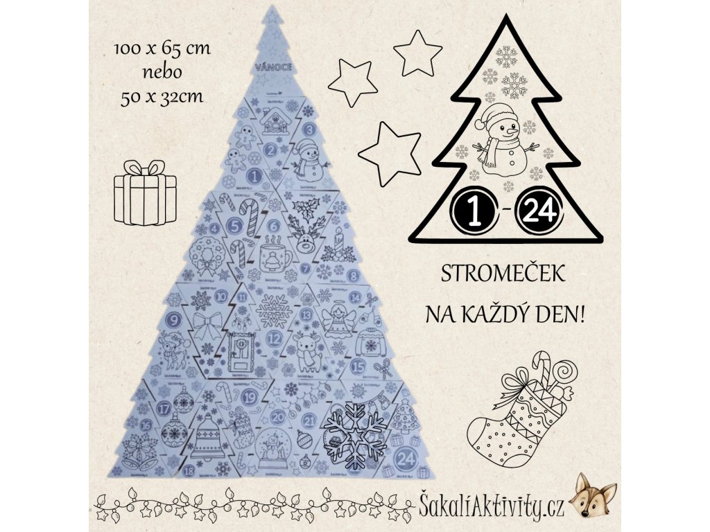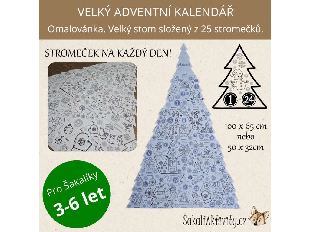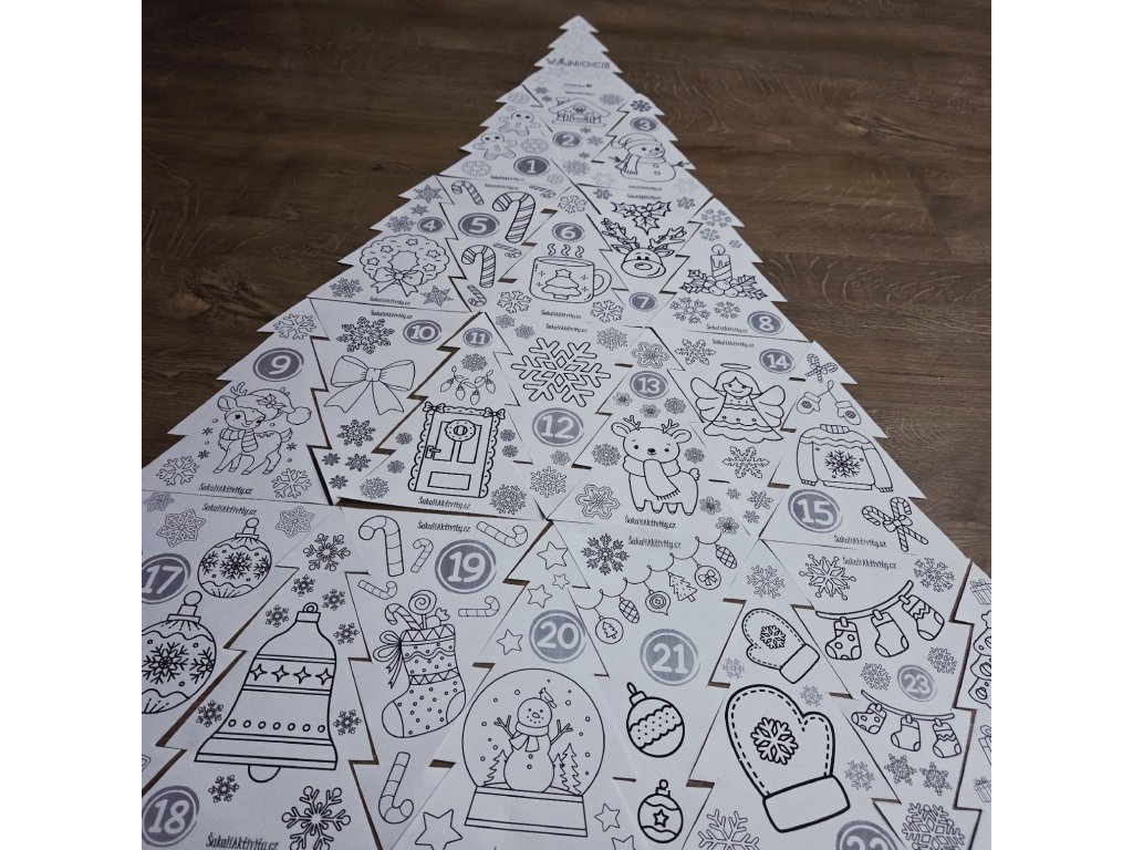 Tento Kooperativní adventní kalendář – Velký Vánoční strom je krásná, tvořivá a smysluplná aktivita, která dětem zpříjemní čekání na Vánoce. Soubor obsahuje 25 stromků s vánočními motivy, označených čísly 1–24. Každý den si děti vystřihnou a vybarví jeden stromeček, a postupně společně sestaví velký třídní, družinový nebo rodinný Vánoční strom. Po kompletním složení má strom přibližně 100 × 65 cm, takže slouží i jako výrazná vánoční dekorace.