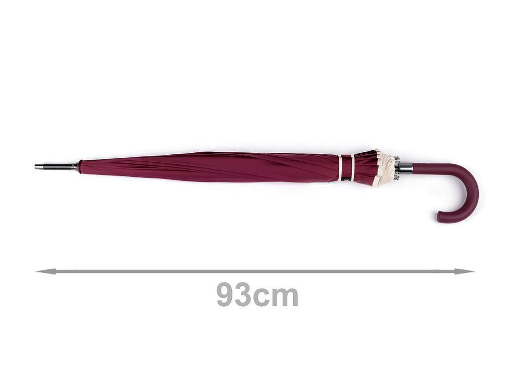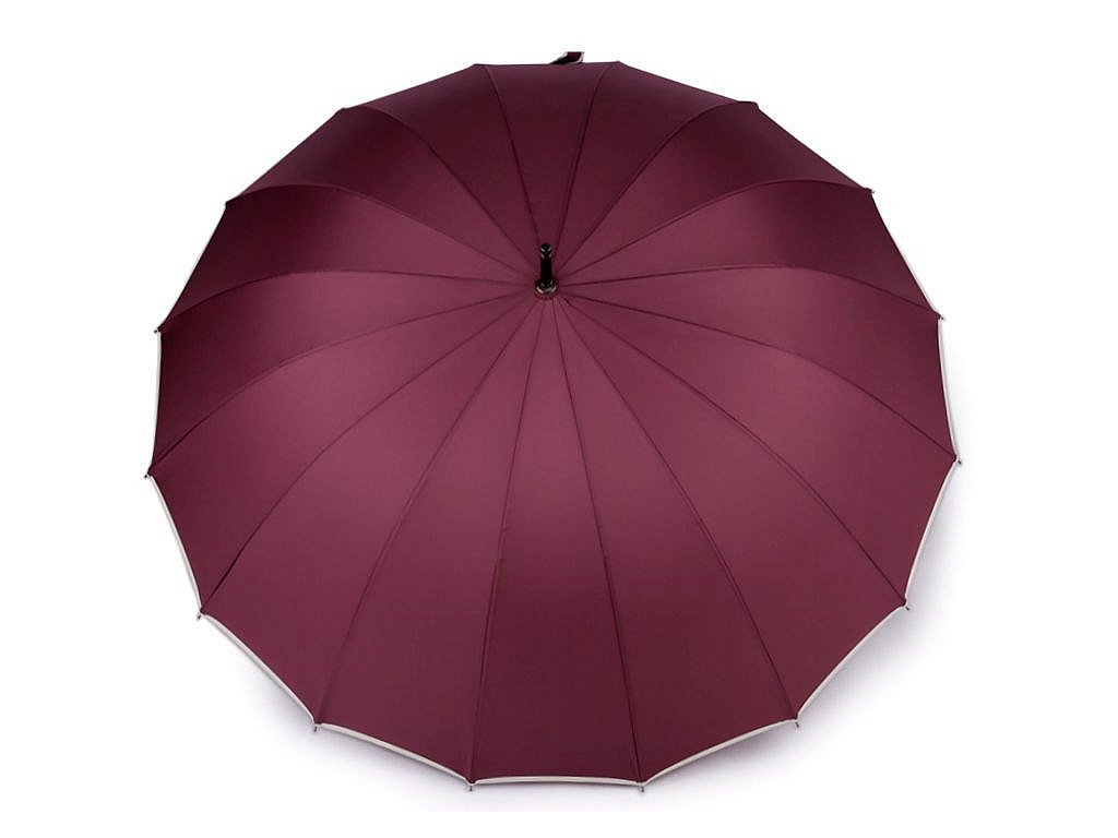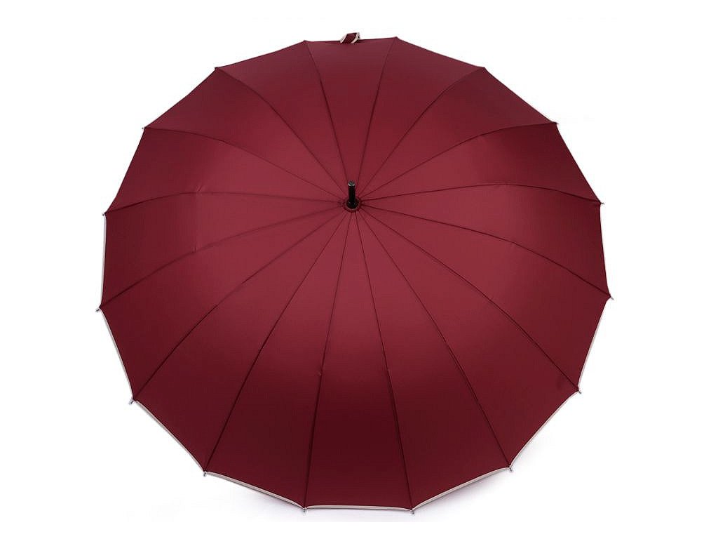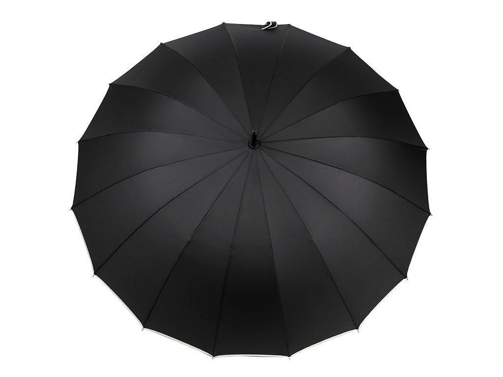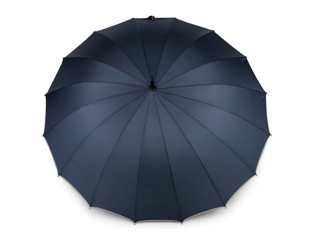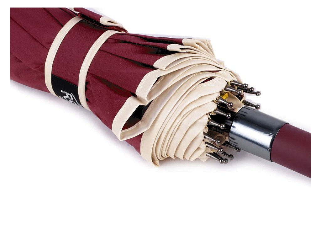 Okraje má olemované decentním barevným proužkem. Má klasickou tyč zakončenou pevnou rukojetí. Skládá se z 16 výsečí, díky kterým se deštník řadí mezi špičkové kousky.