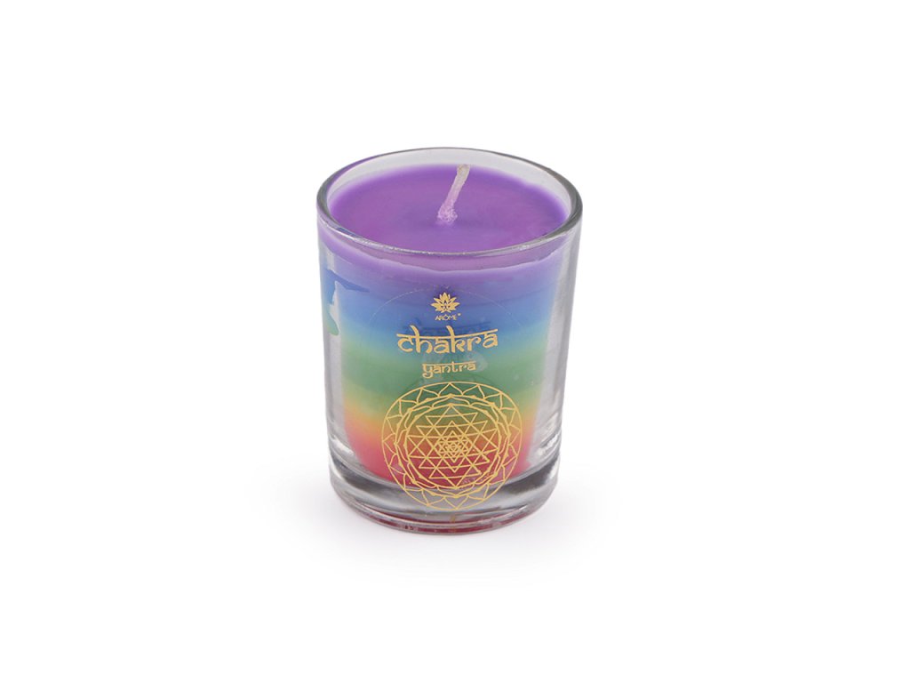 Barevná čakrová svíčka ve skleněné dóze vám doma vykouzlí pohodovou atmosféru a nádherně provoní interiér.