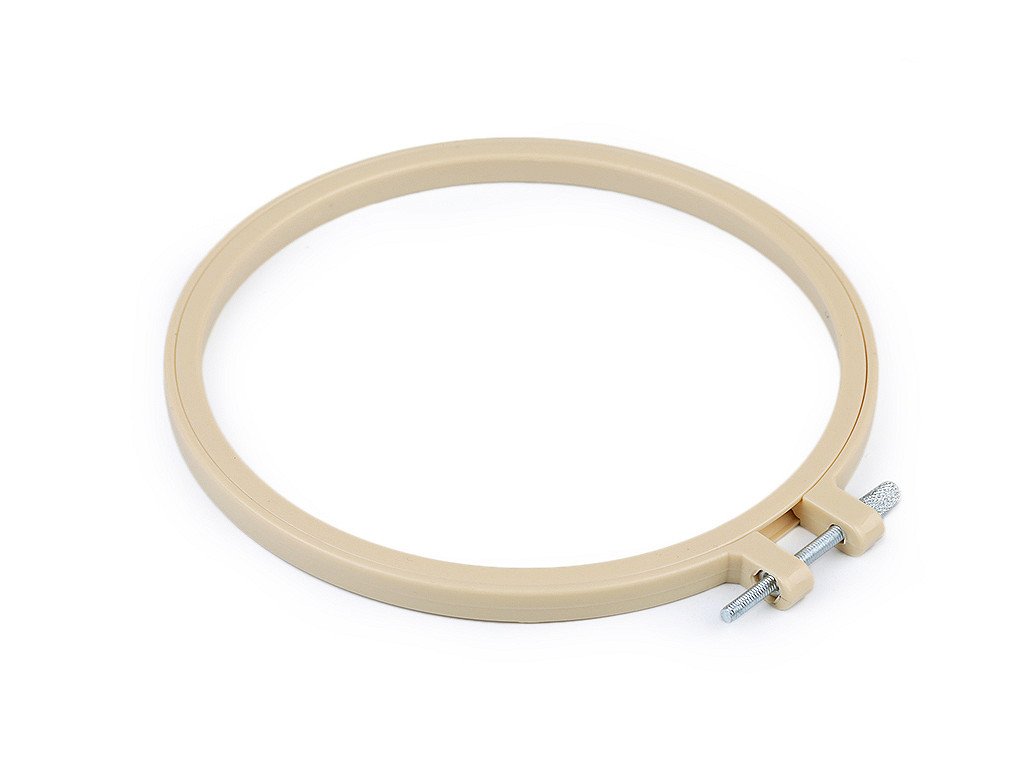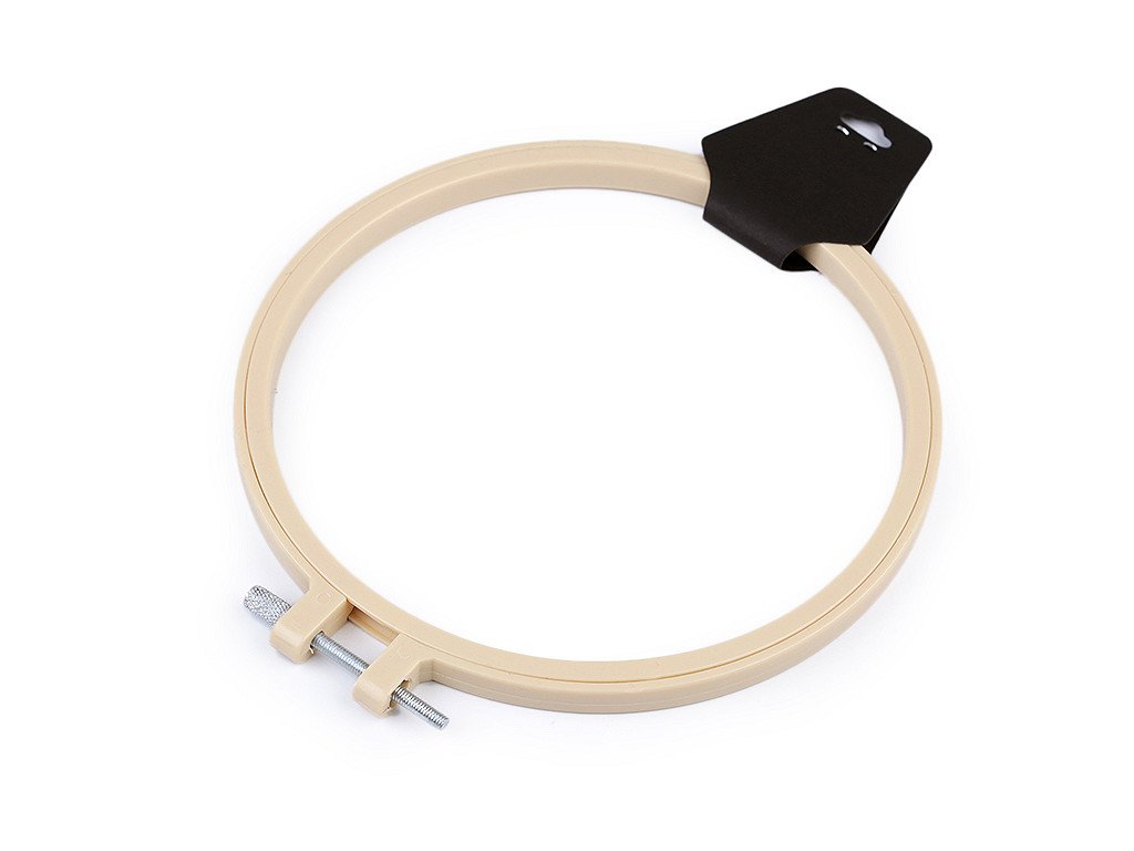 Vyšívací plastový kruh je pevný, opatřený kovovým stahovacím šroubkem, pomocí něhož přichytnete vyšívací tkaninu.