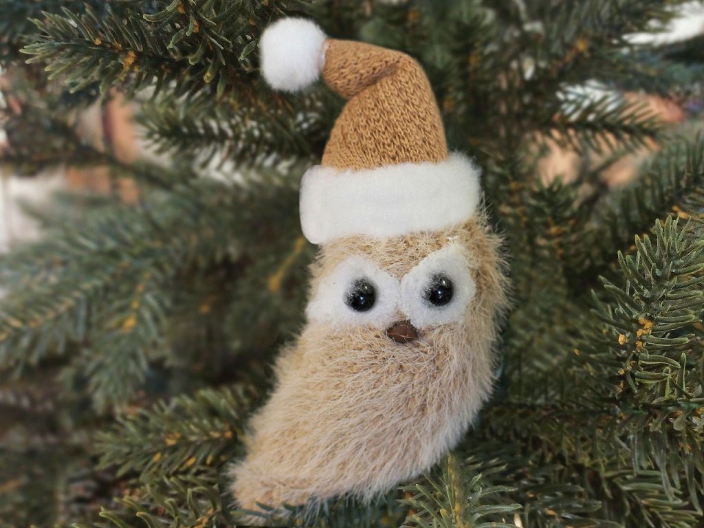 Sovička s zimní čepicí ozdobí vánoční stromečky, věnce, větvičky ve váze, dárky apod.