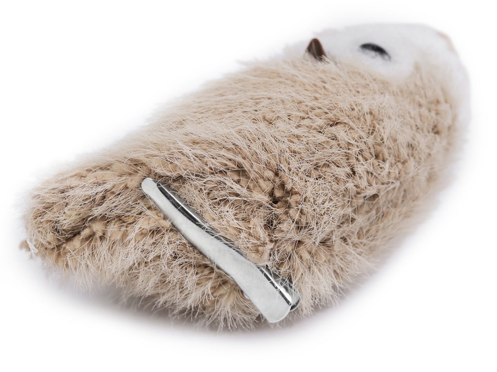 Má jemný plyšový povrch. V dolní části má připevněnou kovovou sponu, díky které ji můžete lehce připevnit.