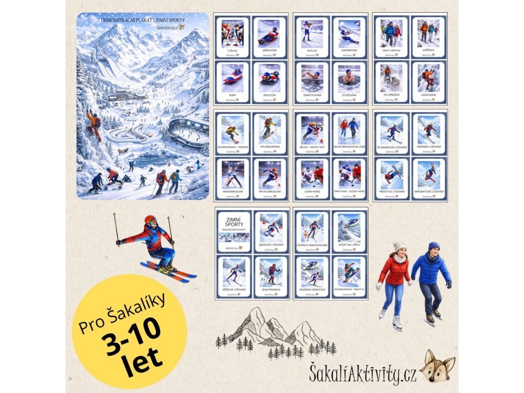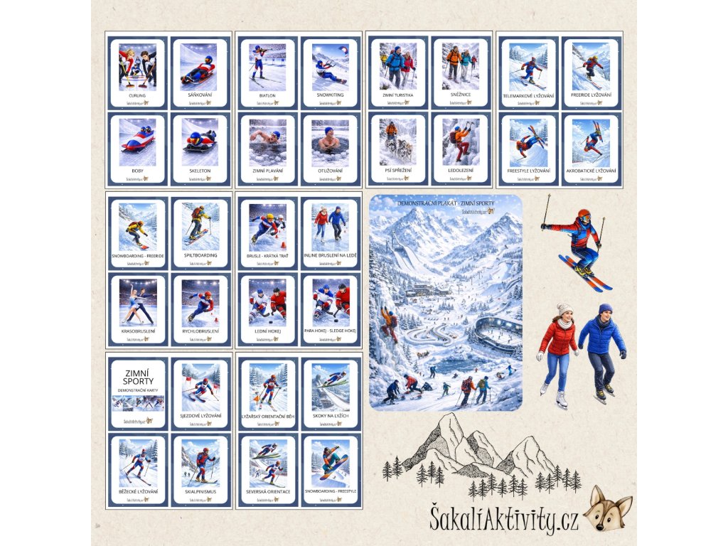 Soubor Zimní sporty – realistické – demonstrační karty je určen dětem předškolního a mladšího školního věku a nabízí přehled 32 demonstračních karet ve formátu A5. Každá karta zobrazuje konkrétní zimní sport nebo aktivitu pomocí realistických až polorealistických ilustrací, které dětem usnadňují pochopení pohybu, postoje těla i sportovního vybavení.