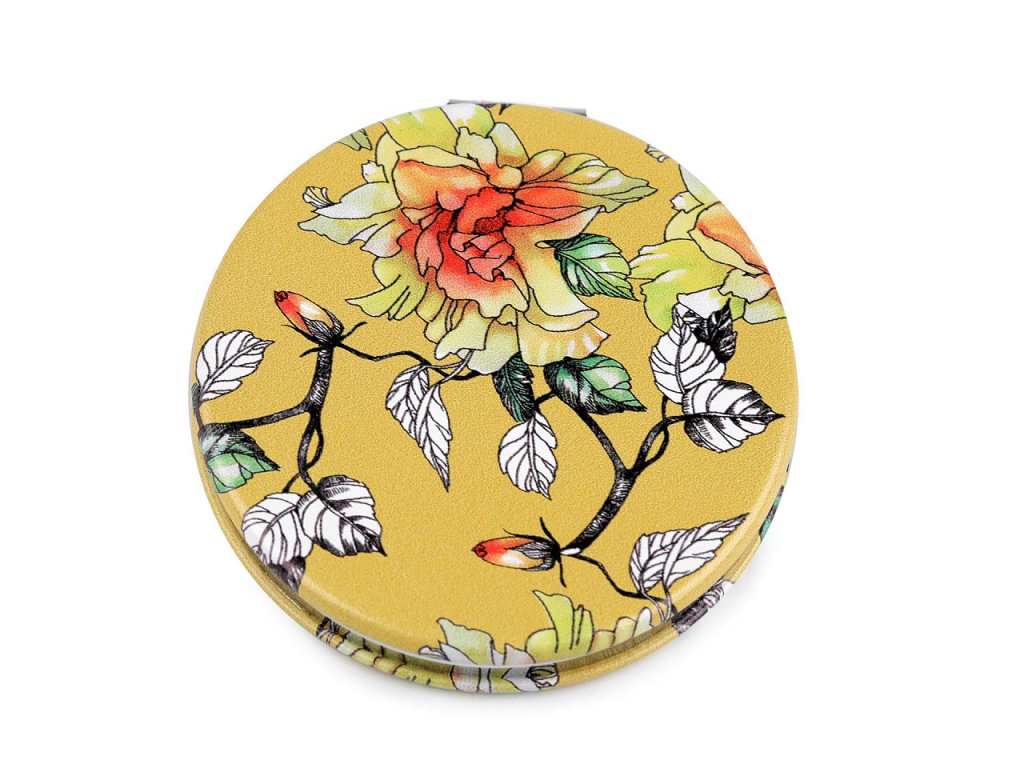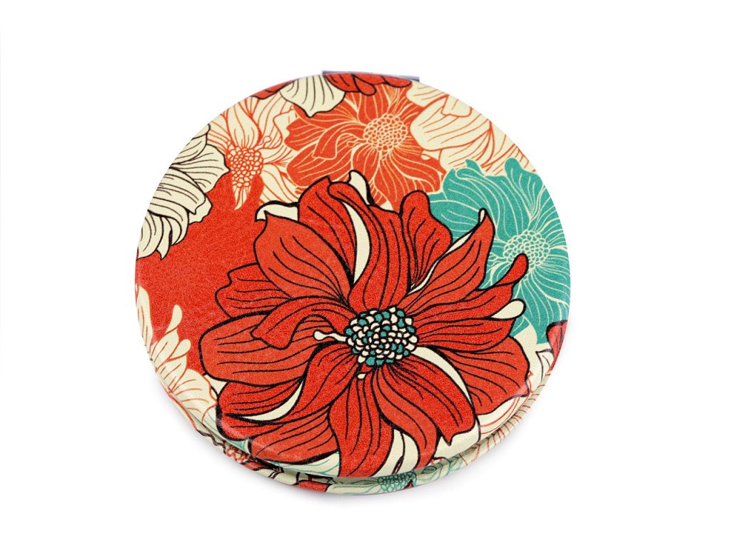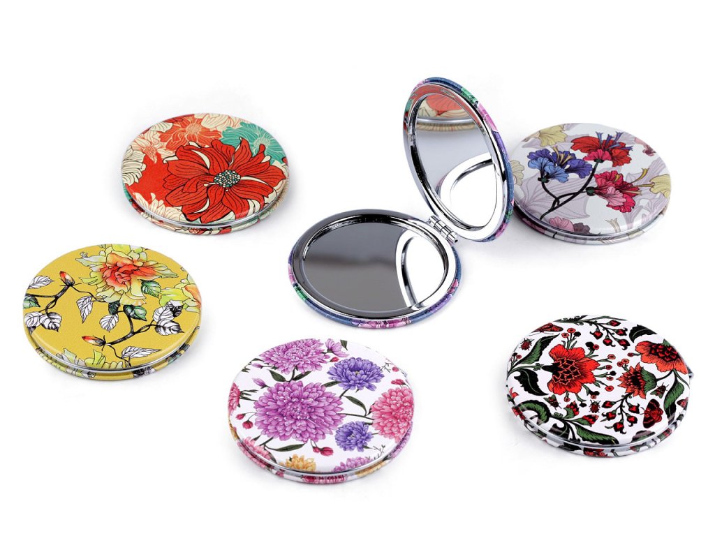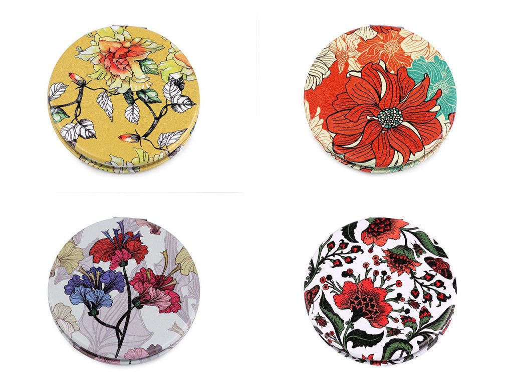 Má kvalitní zpracování z eko kůže s dekorem květů. Potisk je na horní i dolní straně. Uvnitř jsou 2 zrcátka, jedno je zvětšovací.