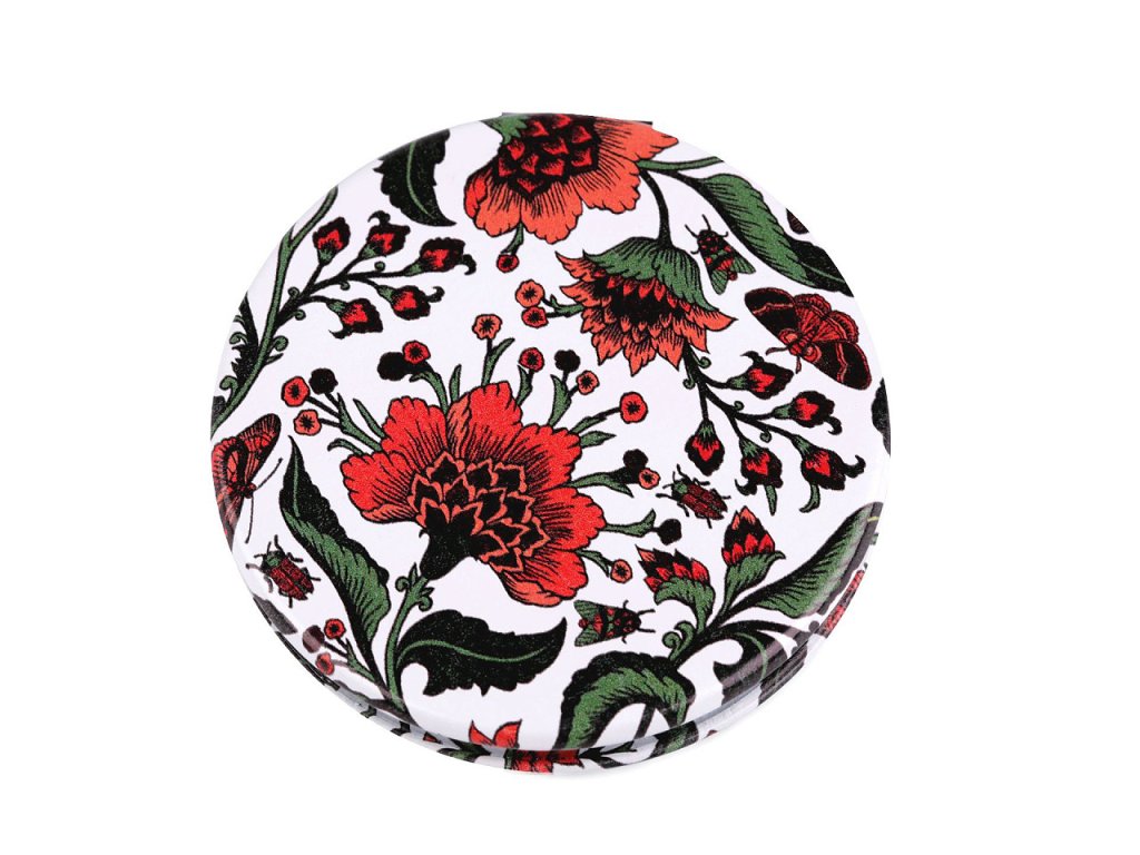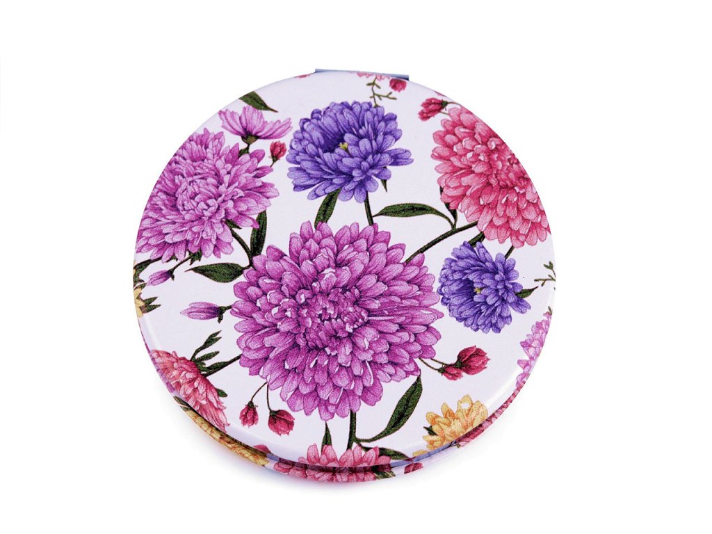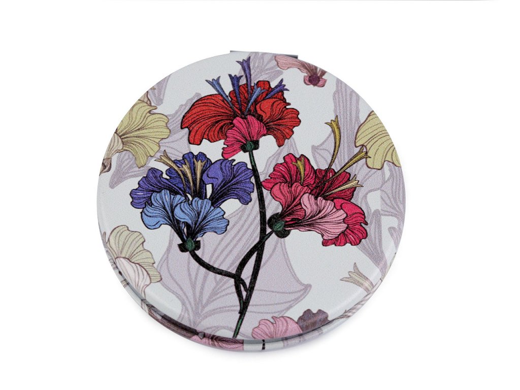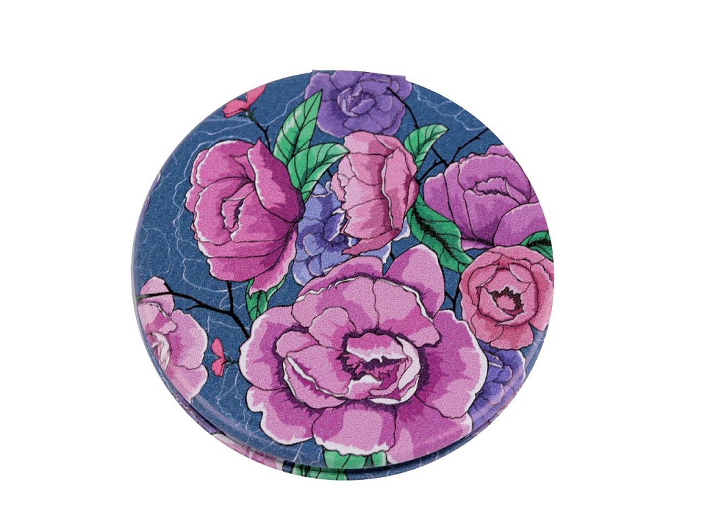Má kvalitní zpracování z eko kůže s dekorem květů. Potisk je na horní i dolní straně. Uvnitř jsou 2 zrcátka, jedno je zvětšovací.