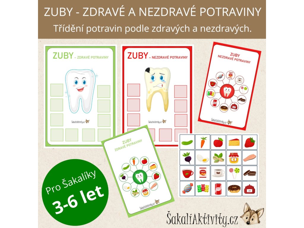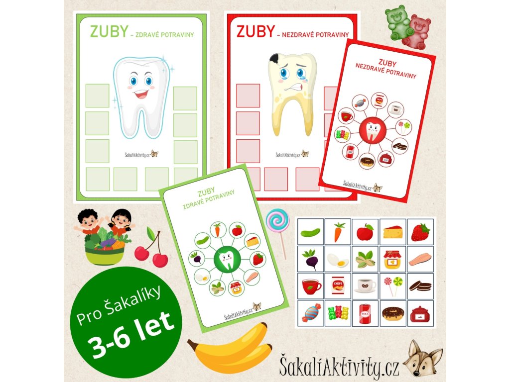 Součástí souboru jsou doplňovací karty ve velikosti A4 s přehledným rozdělením na dvě části – zdravé a nezdravé. Dítě při práci přiřazuje 20 obrázků potravin a nápojů k jedné z těchto skupin podle jejich vlivu na zdraví zubů.